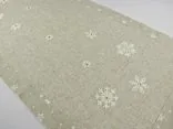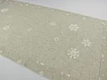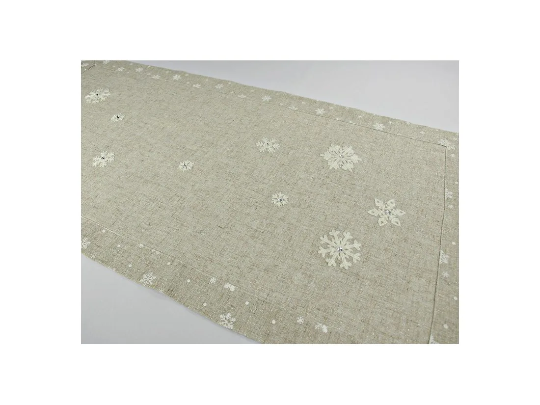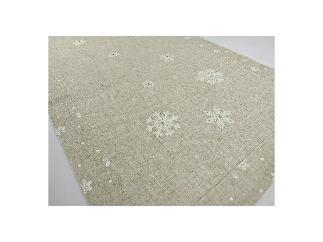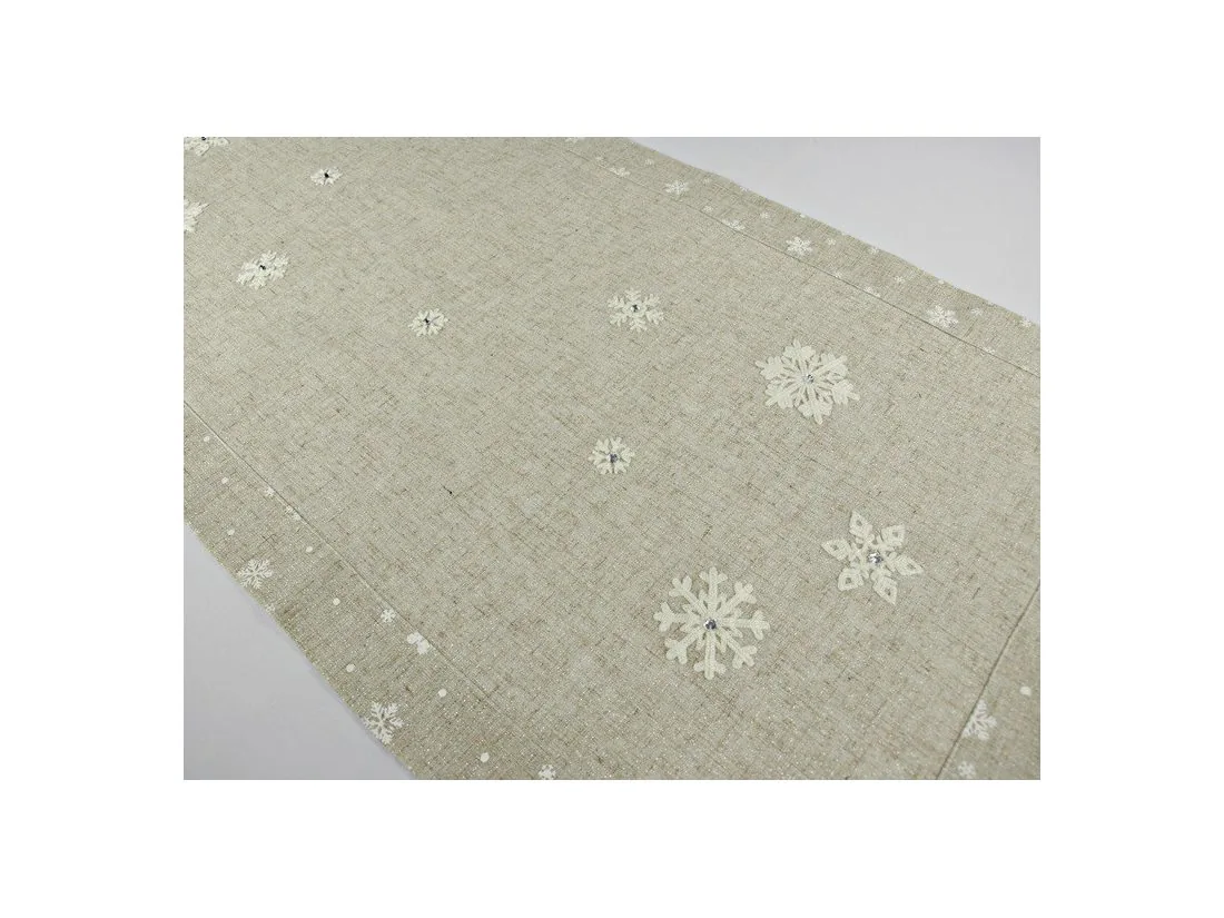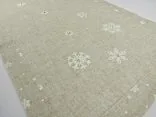 Nakładka świąteczna w rozmiarze 50 x100 cm w kolorze jasno szarym ze srebrna nitką oraz z aplikacją naszytych białych śnieżynek z doszytym srebrnym koralikiem.