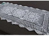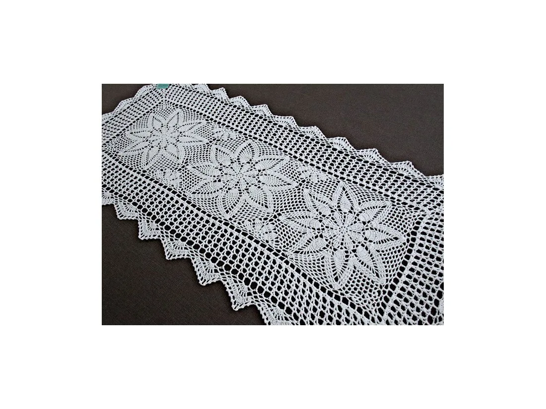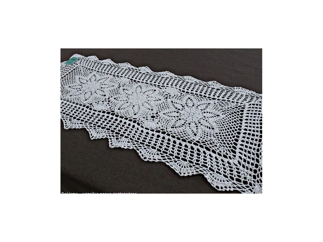 Bieżnik szydełkowy w rozmiarze 50 x 100 cm został wykonany z nici 100 % bawełnianej w kolorze białym.
