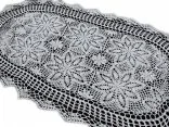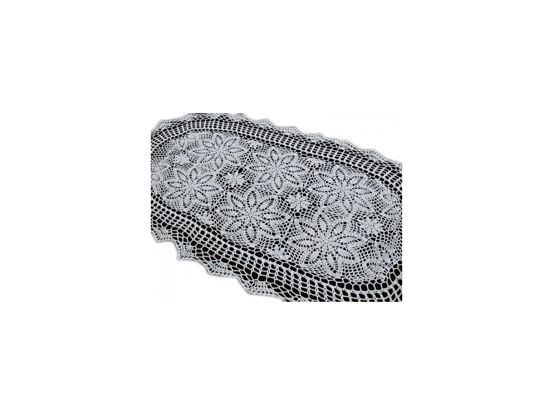 Bieżnik szydełkowy w rozmiarze 60 x 120 cm w kształcie owalnym został wykonany z nici 100 % bawełnianych w kolorze białym.