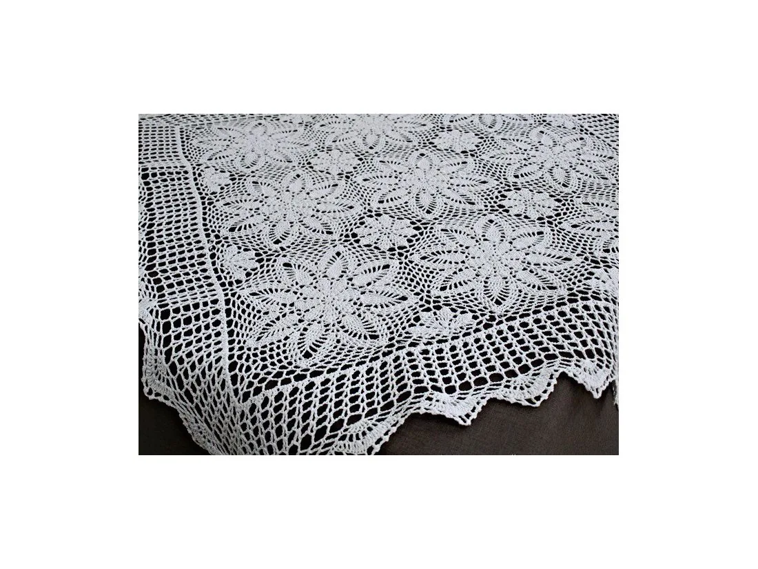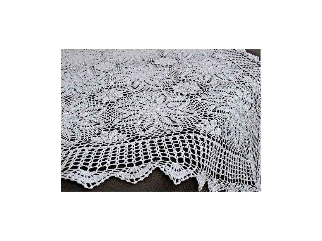 Bieżnik szydełkowy w rozmiarze 85 x 85 cm w kształcie kwadratowym został wykonany z nici 100 % bawełnianych w kolorze białym.