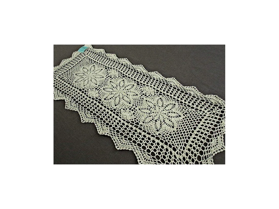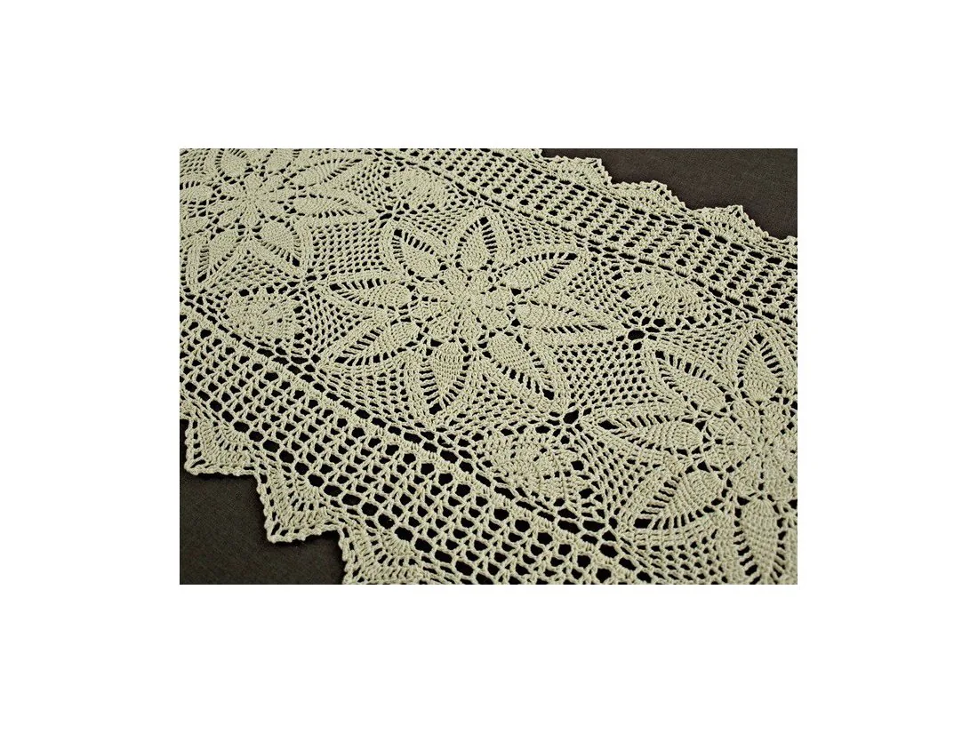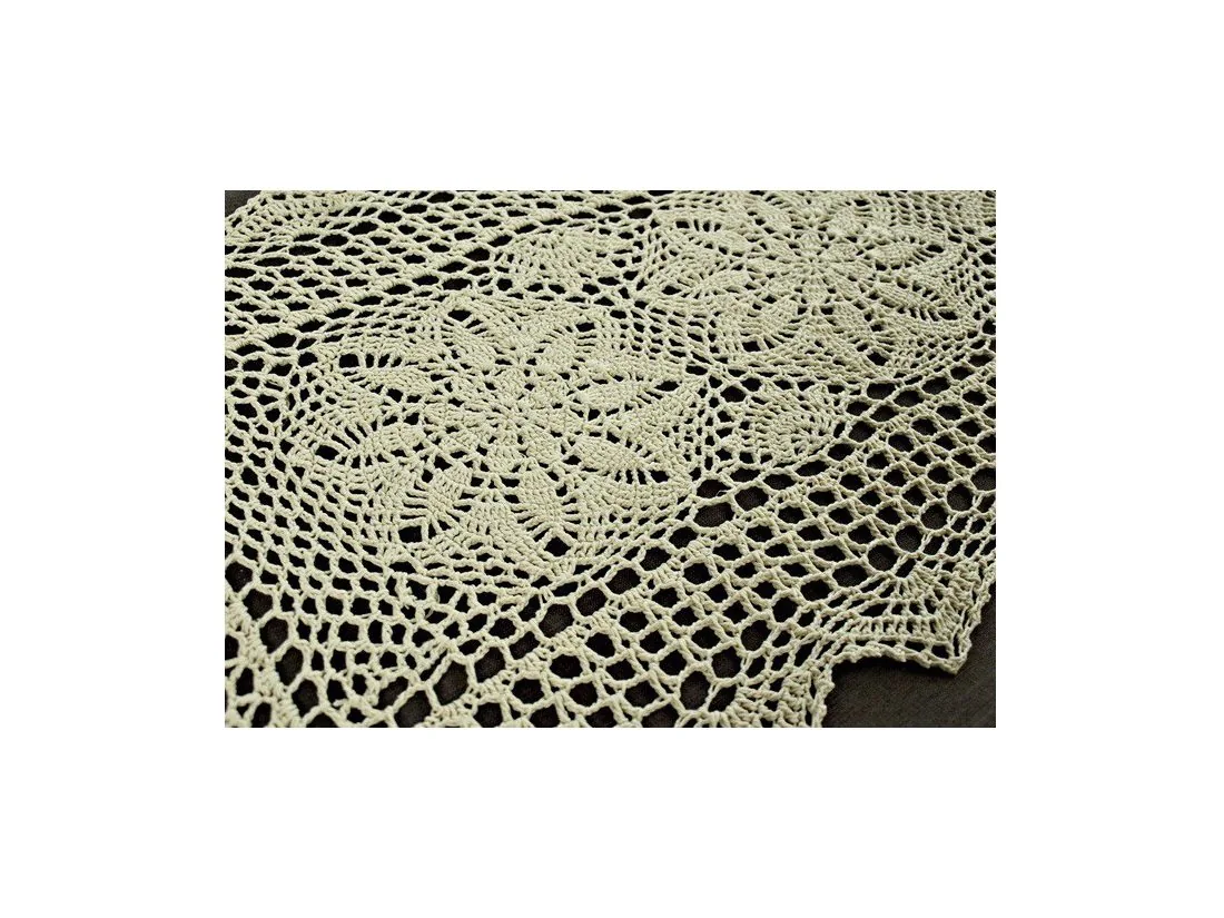 Bieżnik szydełkowy w rozmiarze 50 x 100 cm został wykonany z nici 100 % bawełnianej w kolorze lnianym.