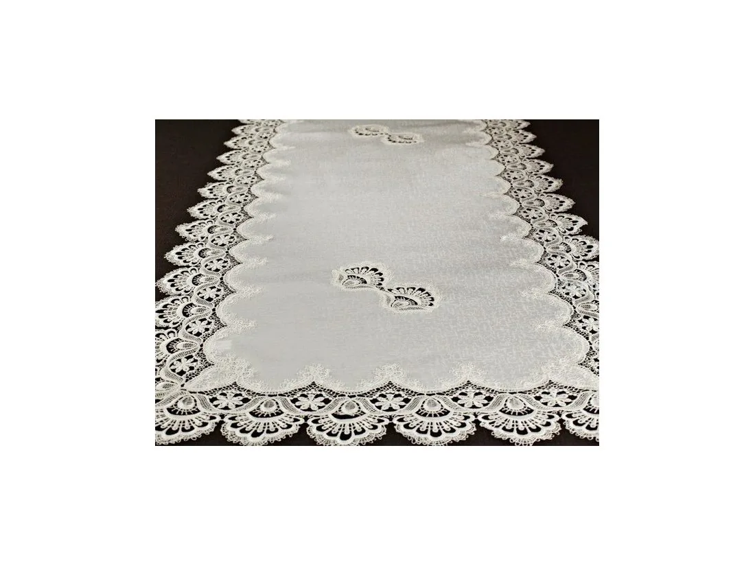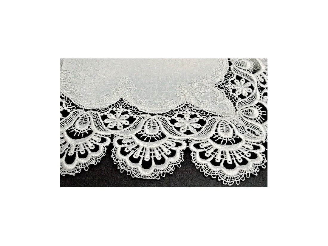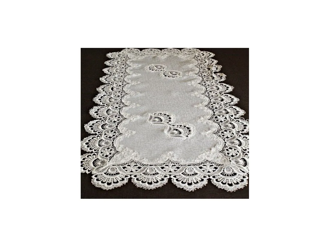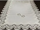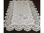 Klasyczny Bieżnik w rozmiarze 60x120 cm obszyty elegancką gipiurą wykonany z tkaniny 100 % poliestrowej w kolorze białym w kształcie prostokąta.