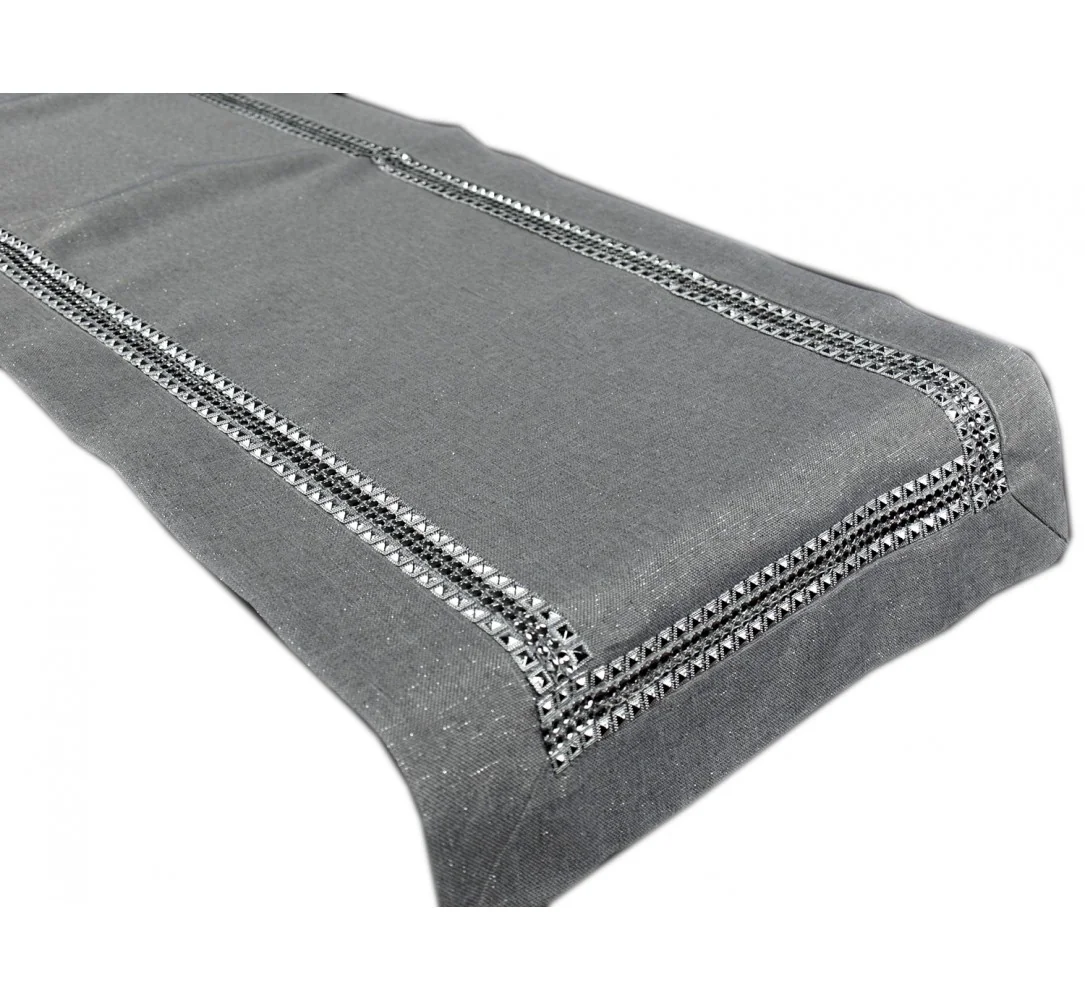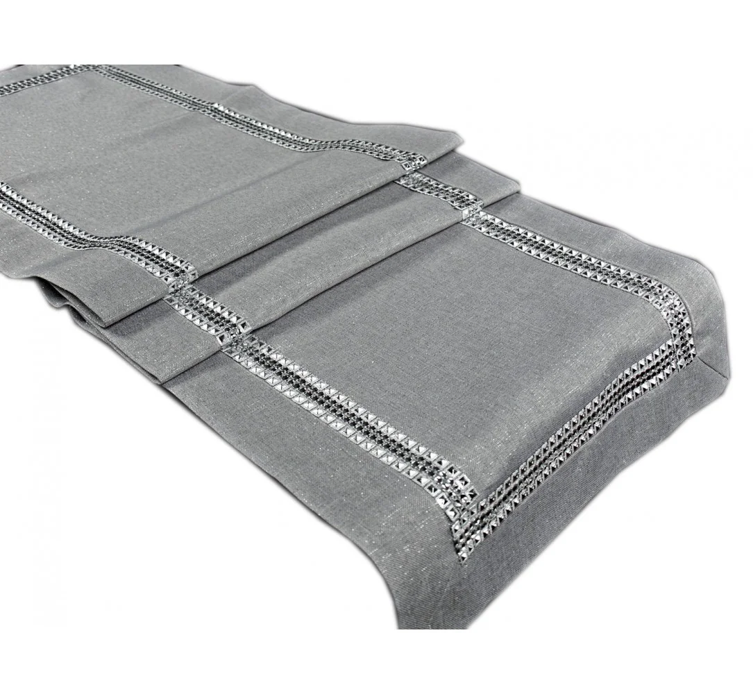 Dekoracyjny bieżnik / szal w rozmiarze 40x140 cm w kolorze popielatym / szarym przeplatany srebrną nitką oraz naszyta srebrną listwą imitującą cyrkonie została wykonana ze 100 % poliestrowej tkaniny.