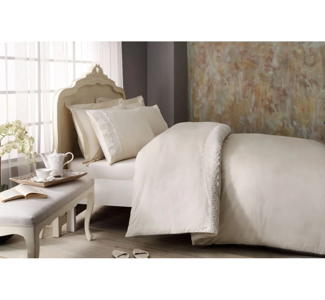 Ekskluzywny 6 częściowy komplet pościel z kolekcji Guipure został wykonany z najwyższej jakości 100 % bawełny o gęstym satynowym splocie jest miły i delikatny w dotyku. Efektowne dekoracyjne doszycia delikatnej koronki na pościeli sprawiają, że pościel nada wyrafinowany elegancki wygląd naszej sypialni. Subtelne wzornictwo oraz stonowana kolorystyka pozwoli dobrać komplet pościeli do każdej sypialni nadając jej niepowtarzalnego eleganckiego uroku.
