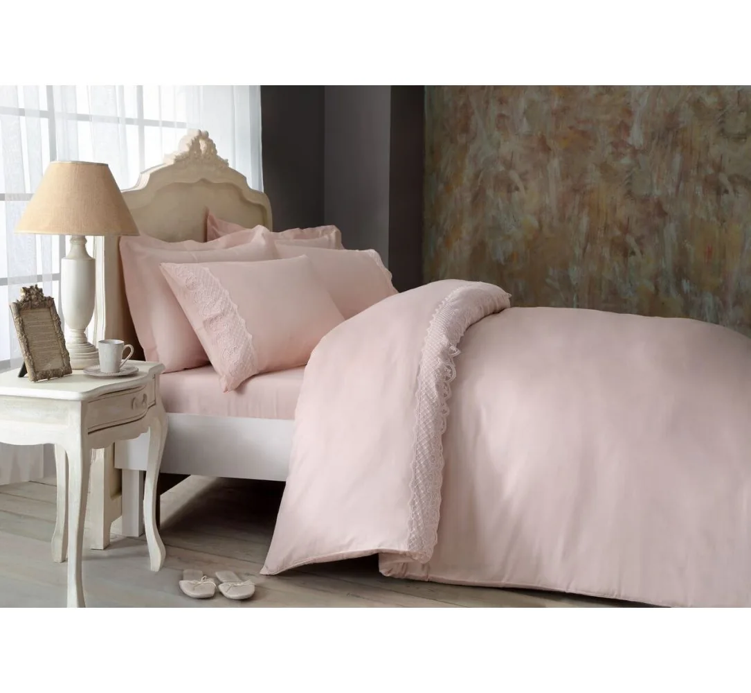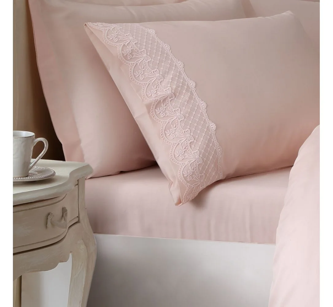 Luksusowa pościel z koronką 6 elementowa wzór Olivia Pink w rozmiarze 200 X 220 cm firmy TIVOLYO HOME z kolekcji Guipure, to ekskluzywna pościel dla każdego kto w swojej sypialni ceni luksus i elegancje.