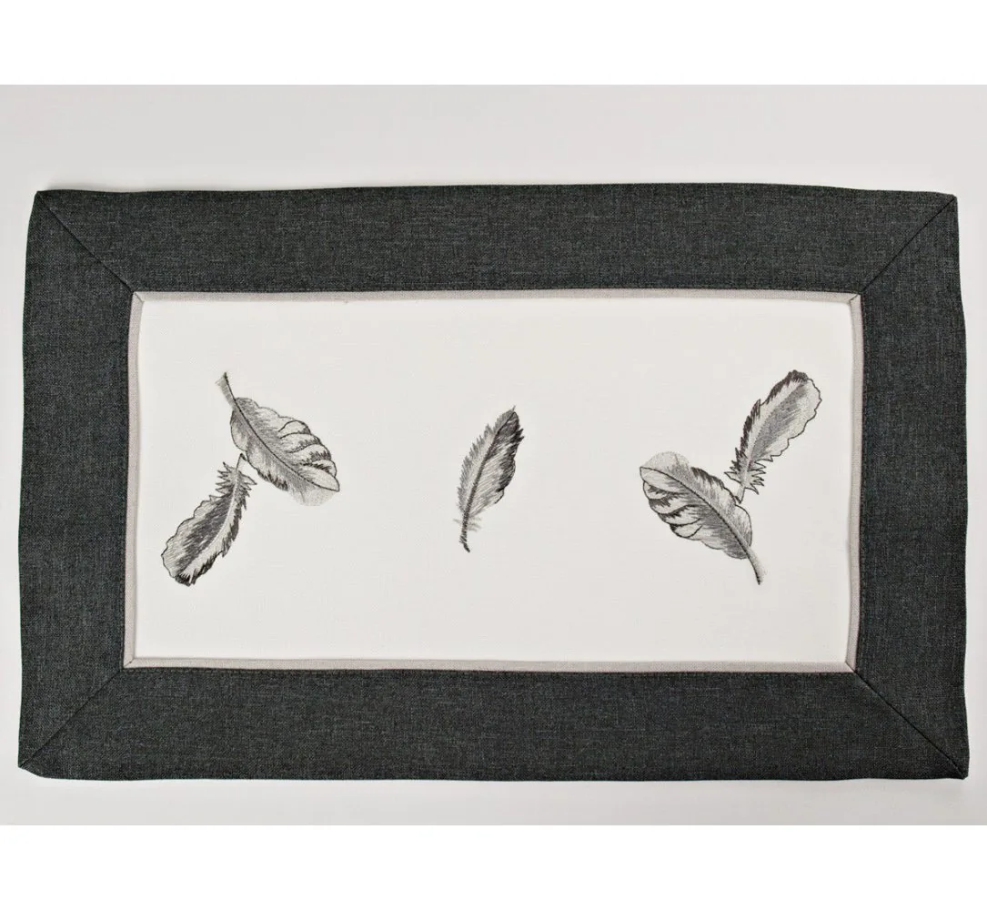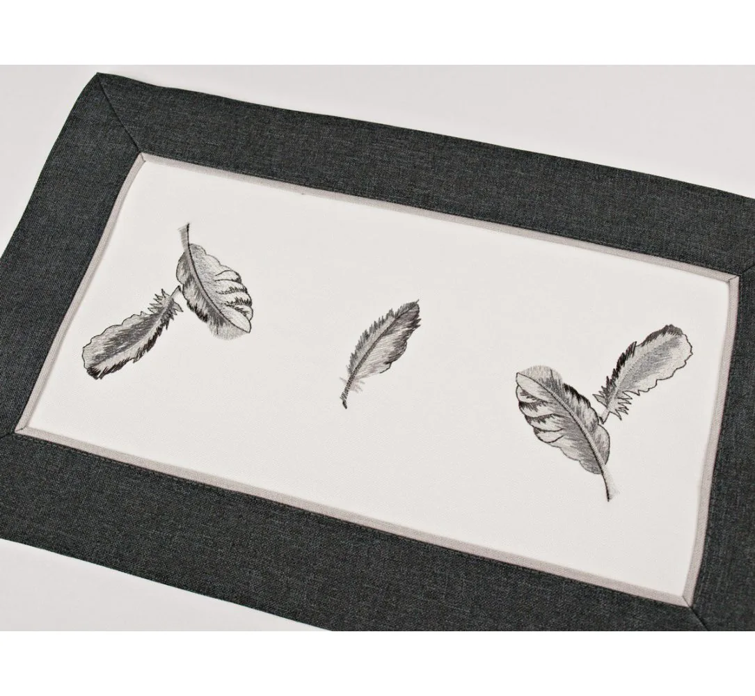 Dekoracyjny haftowany bieżnik w rozmiarze 30 x 45 cm w kolorze biało szaro grafitowym z wyhaftowanymi modnymi piórkami.