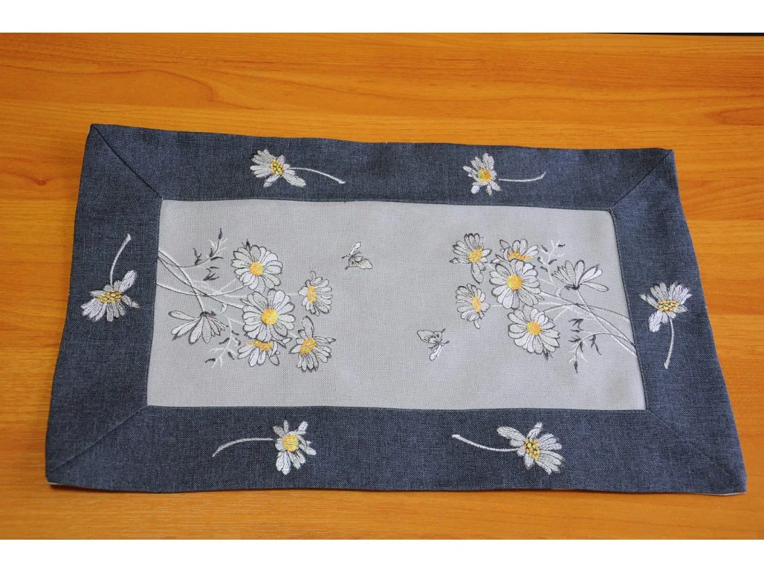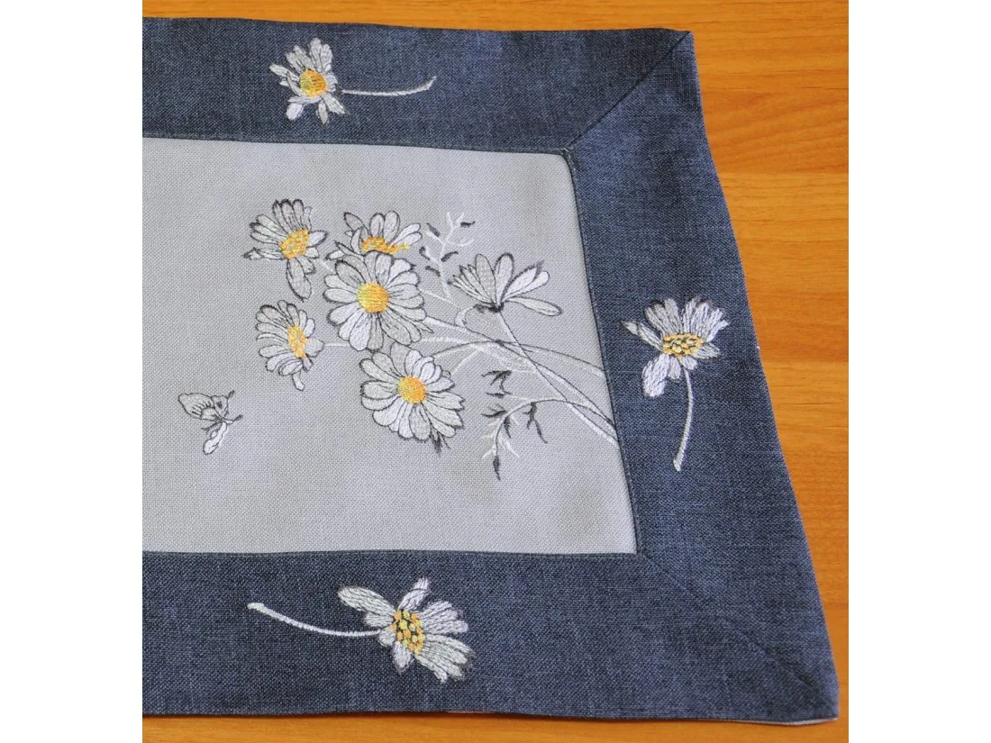 Haftowana serwetka w rozmiarze 30 x 45 cm w kolorze szaro grafitowym z dekoracyjnym haftem margaretek i motylka.
