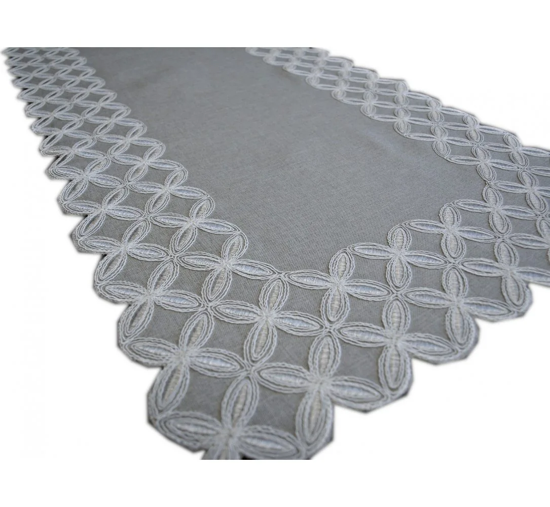 Dekoracyjny haftowany bieżnik w rozmiarze 40 x 140 cm w kolorze szarym z haftowanymi białymi kwiatkami.