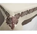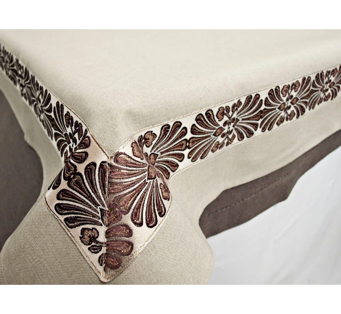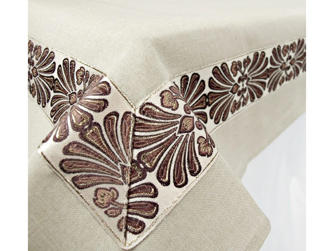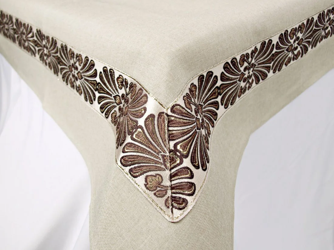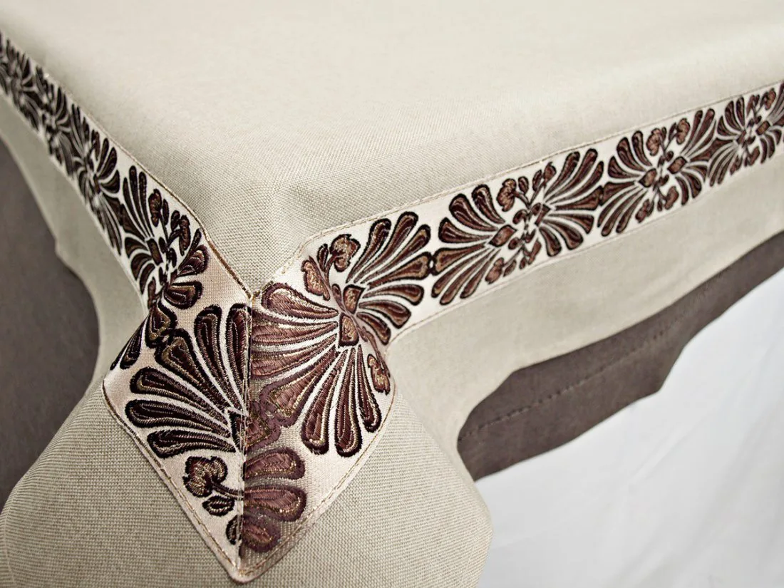 Haftowany Obrus z delikatnym kwiatowym wzorem, haft wykonany złotą nitką, w rozmiarze 150 x 300 cm w kolorze beżowo brązowym.