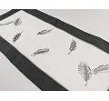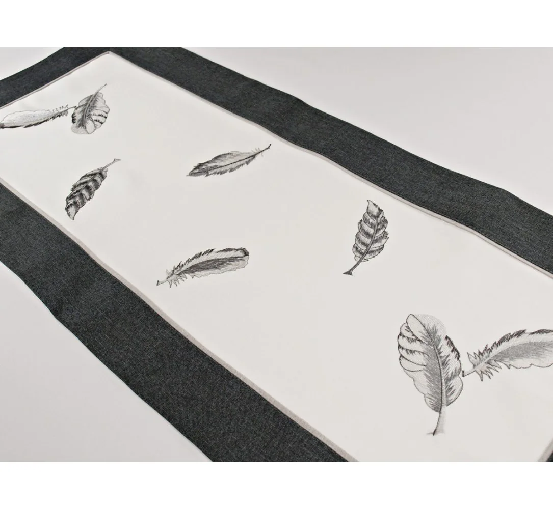 Dekoracyjny haftowany bieżnik w rozmiarze 40 x 90 cm w kolorze biało szaro grafitowym z wyhaftowanymi modnymi piórkami.