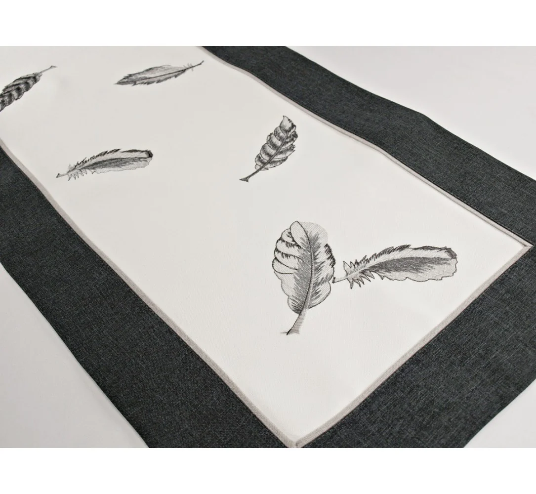 Haftowany bieżnik charakteryzuje się nowoczesnym desingiem, prostym wzornictwem oraz modnym szaro grafitowo białym kolorem. Bieżnik jest w kolorze białym z precyzyjnie wykonanym haftem w modne piórka w kolorze szaro popielatym.