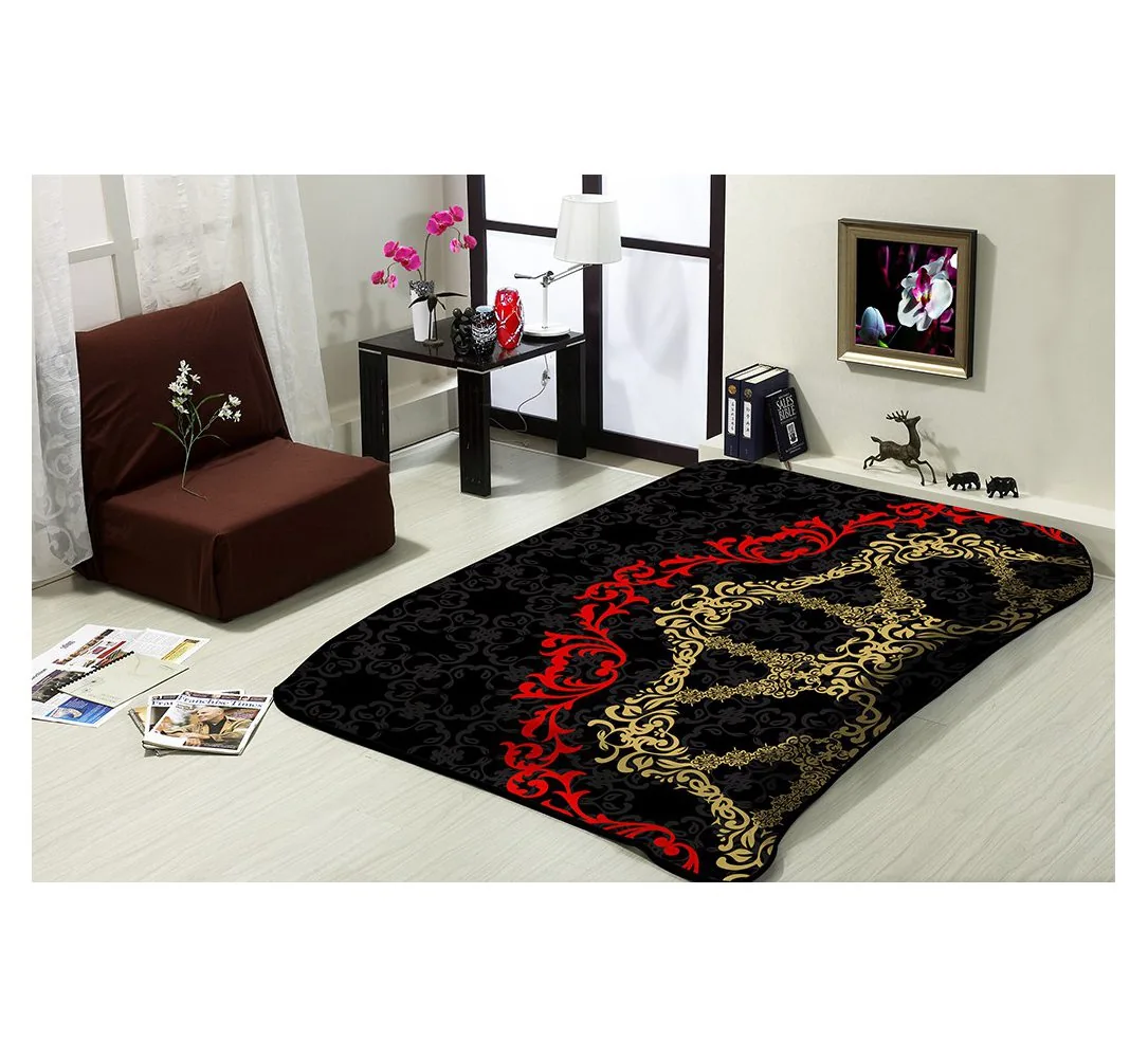Luksusowy akrylowy koc 160x220 z finezyjnym wzorem 261 w ciekawej czarno szaro czerwonej kolorystyce podkreśli oryginalność każdej sypialni.
