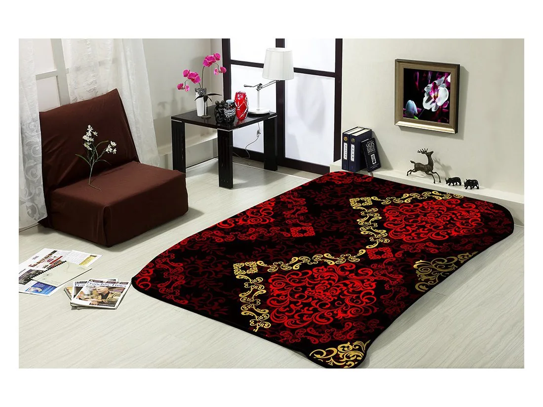 Luksusowy akrylowy koc 160x220 z fantazyjnym wzorem 264 w ciekawej czarno grafitowo czerwonej kolorystyce podkreśli oryginalność każdej sypialni.