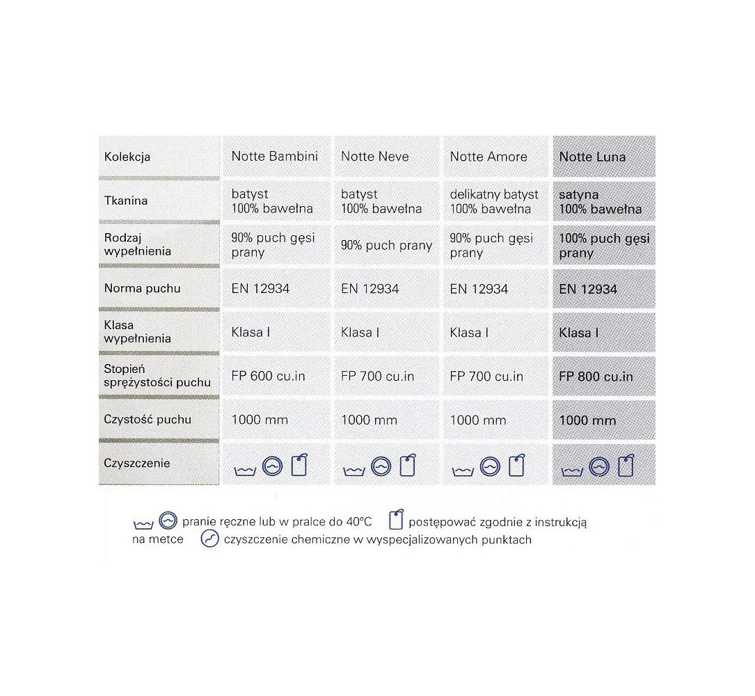 Wypełnienie kołdry jest zgodne z normą PN-EN 12934 klasa I, sprężystość puchu 650 cu.in