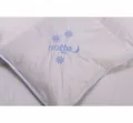 Poszycie kołdry stanowi 100% bawełniana, delikatna, biała tkanina o satynowym splocie. Kołdra wykończona jest elegancką plecioną, satynową bizą w kolorze błękitnym oraz zdobiona haftowanym logo w tym samym kolorze.
