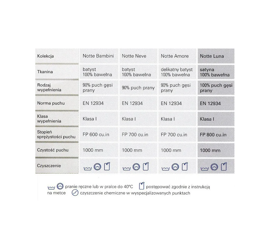 Wypełnienie kołdry jest zgodne z normą PN-EN 12934 klasa I, sprężystość puchu 700 cu.in