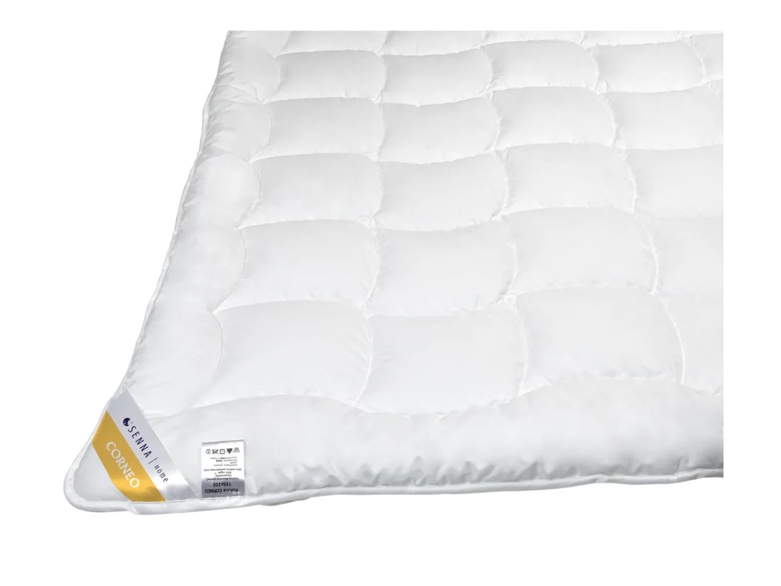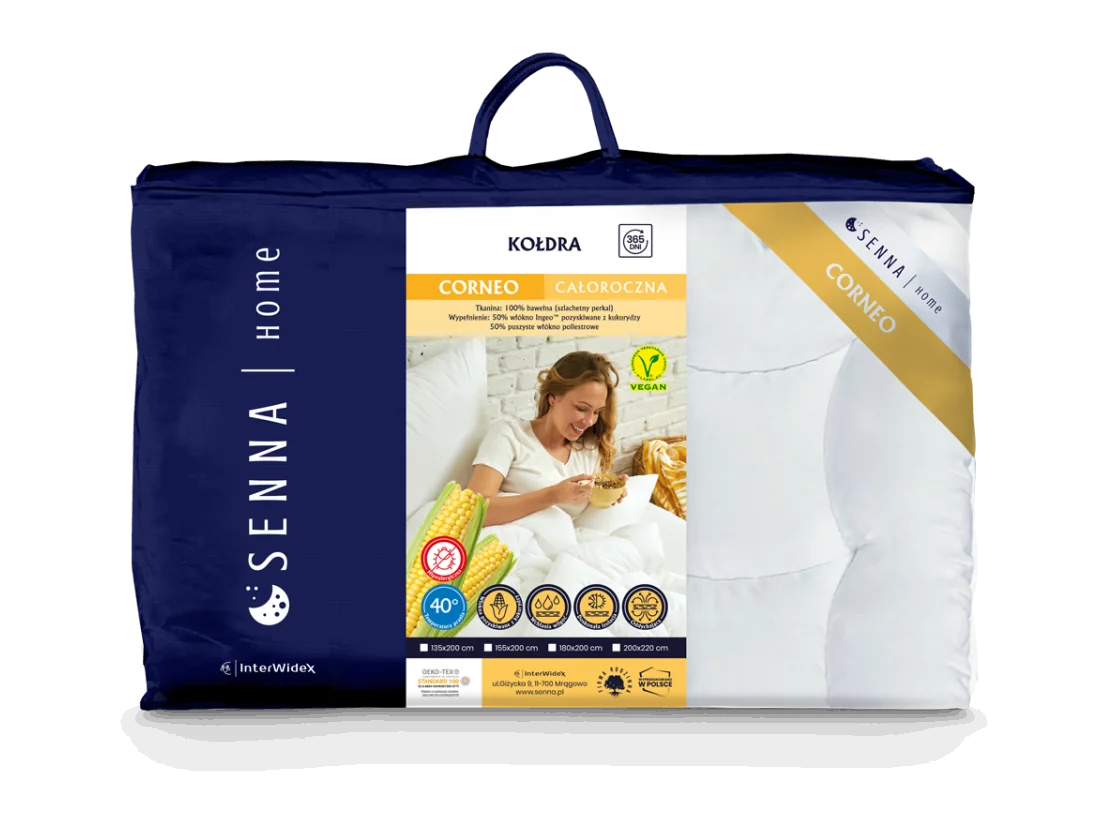 Kołdra Corneo w rozmiarze 135x200 to całoroczna antyalergiczna i ekologiczna kołdra z włóknami Ingeo™ w poszyciu bawełnianym. Wypełnienie stanowi włókno Ingeo które łączy zalety wypełnienia naturalnego i syntetycznego – posiada wszystkie właściwości wysokiej jakości włókien syntetycznych a jednocześnie oferuje wyjątkowy komfort płynący z jego naturalności. Zastosowana na poszycie kołdry tkanina perkal została wykonana ze 100 % bawełny powoduje, że kołdra jest delikatna, miękka a także ma wysoką zdolność do absorbowania wilgoci przez co zapewnia nam miły i spokojny sen.