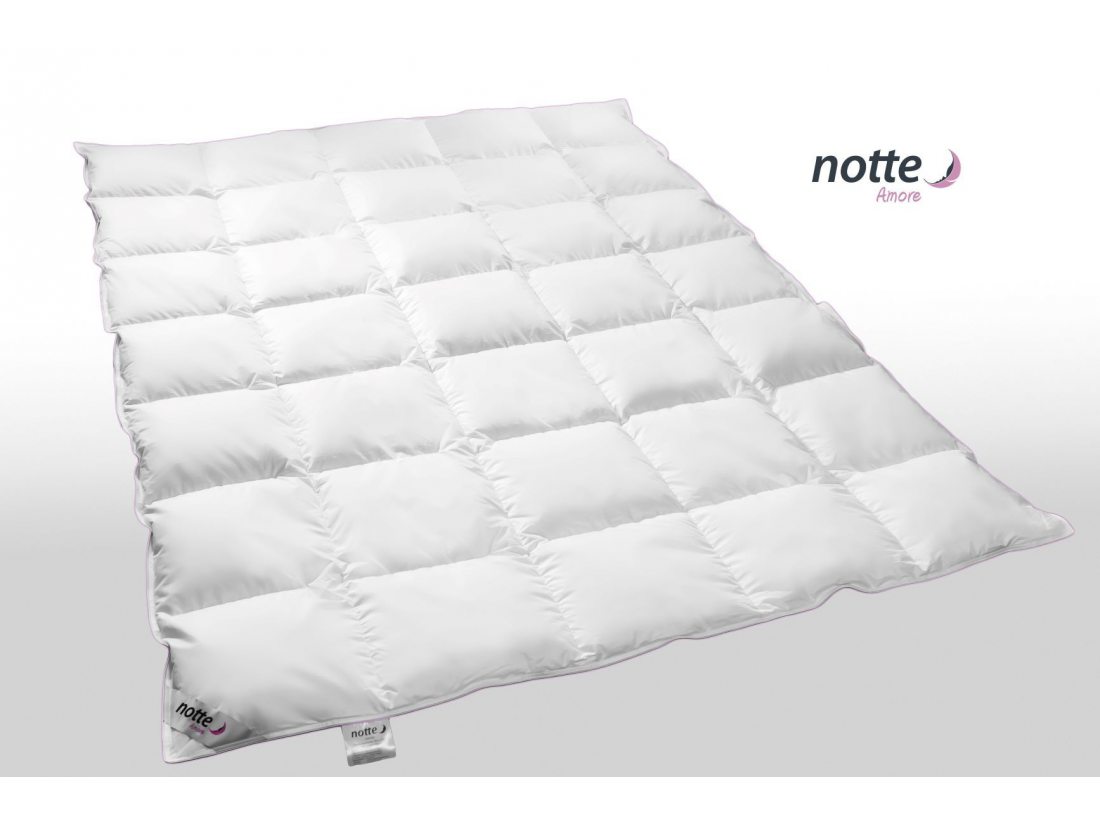 Poszycie kołdry wykonane jest z wysokiej jakości batystu bawełnianego, który jest niezwykle delikatny w dotyku. Zapewnia to dodatkowy komfort i przyjemność użytkowania kołdry. Dodatkowo, kołdra Notte Amore posiada atest NOMITE, który przyznawany jest wyłącznie produktom pościelowym, które spełniają najsurowsze normy higieniczne.
