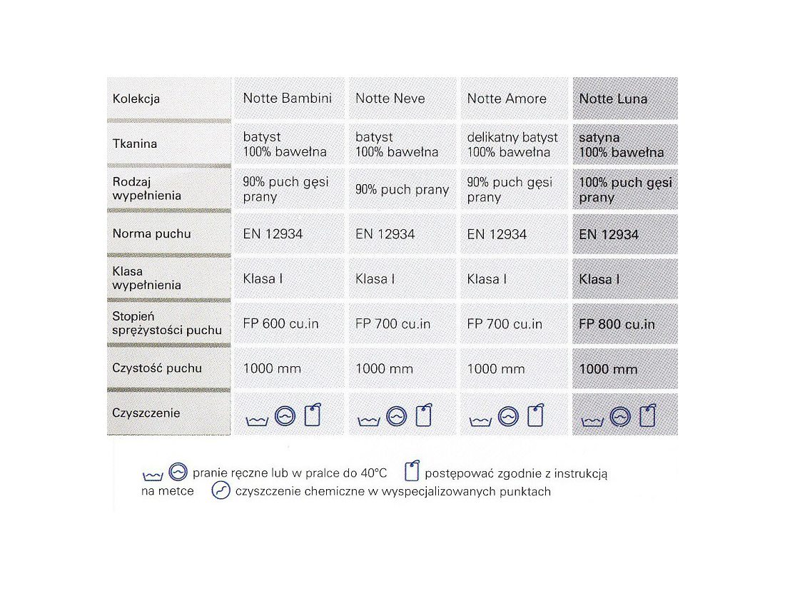 Wypełnienie kołdry jest zgodne z normą PN-EN 12934 klasa I, sprężystość puchu 700 cu.in