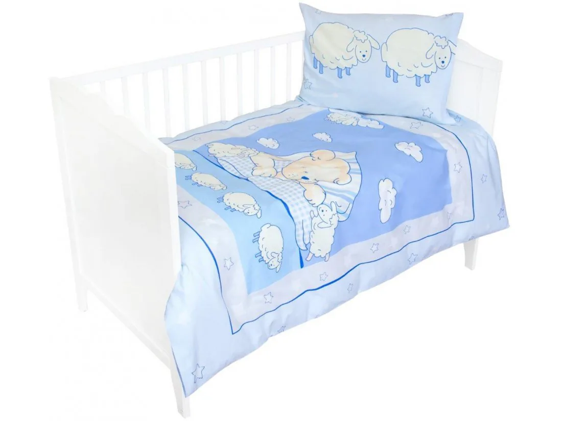 Pościel do łóżeczka Miś z owieczką niebieski w rozmiarze 100x135 z poszewką 40x60 polskiej firmy Detexpol dla dzieci została wykonana z wysokiej jakości 100 % bawełny.