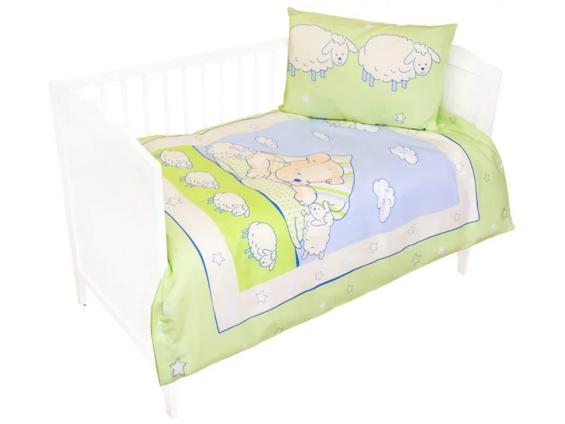 Pościel do łóżeczka wzór Miś z owieczką zielony w rozmiarze 100x135 z poszewką 40x60 polskiej firmy Detexpol dla dzieci została wykonana z wysokiej jakości 100 % bawełny.