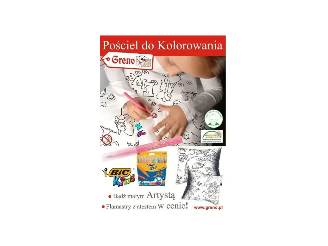 Komplet pościeli z bawełny 140x200 do samodzielnego kolorowania z pisakami firmy Greno przeznaczona jest dla naszych najukochańszych najmłodszych.