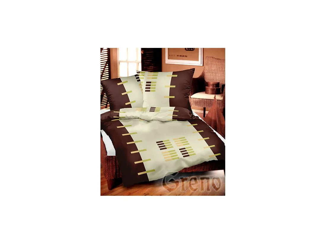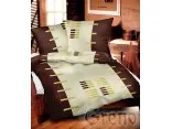Duży graficzny wzór oraz modne kontrastowe zestawienie koloru jasnego kremu z ciepłym brązem oraz wstawkami wzoru w kolorze zielonym i ciemno kremowym to propozycja dla kreatywnych osób lubiących nowatorski i nowoczesny styl w swoich alkowach.
