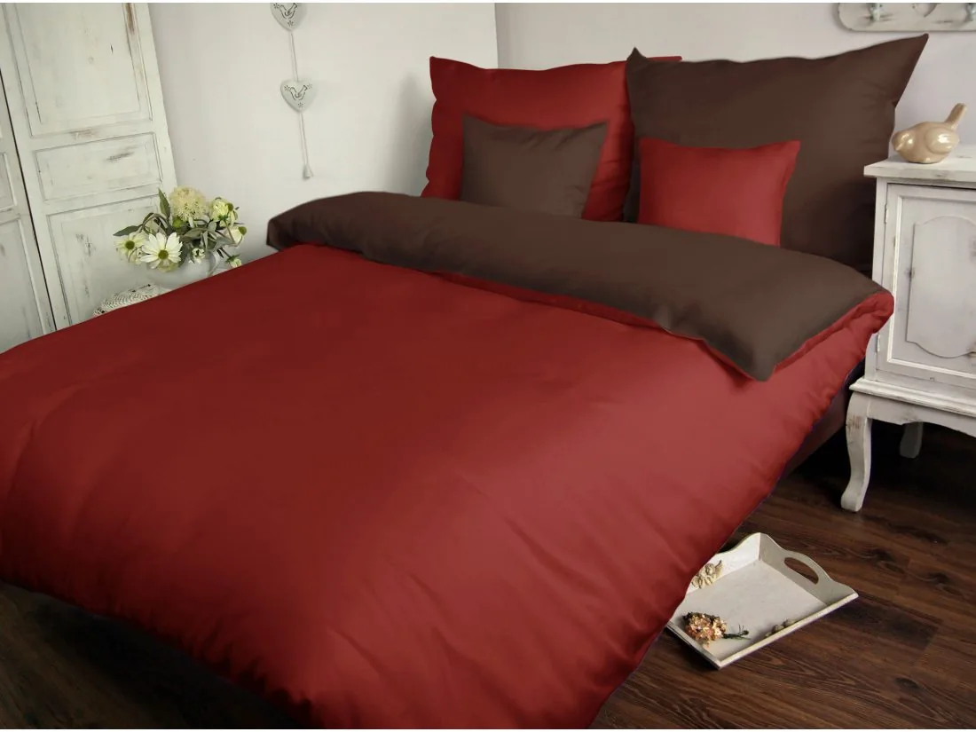 Trzyczęściowy komplet pościeli satynowej dwukolorowej w rozmiarze 180x200 cm firmy Darymex w kolorze bordowo brązowym.