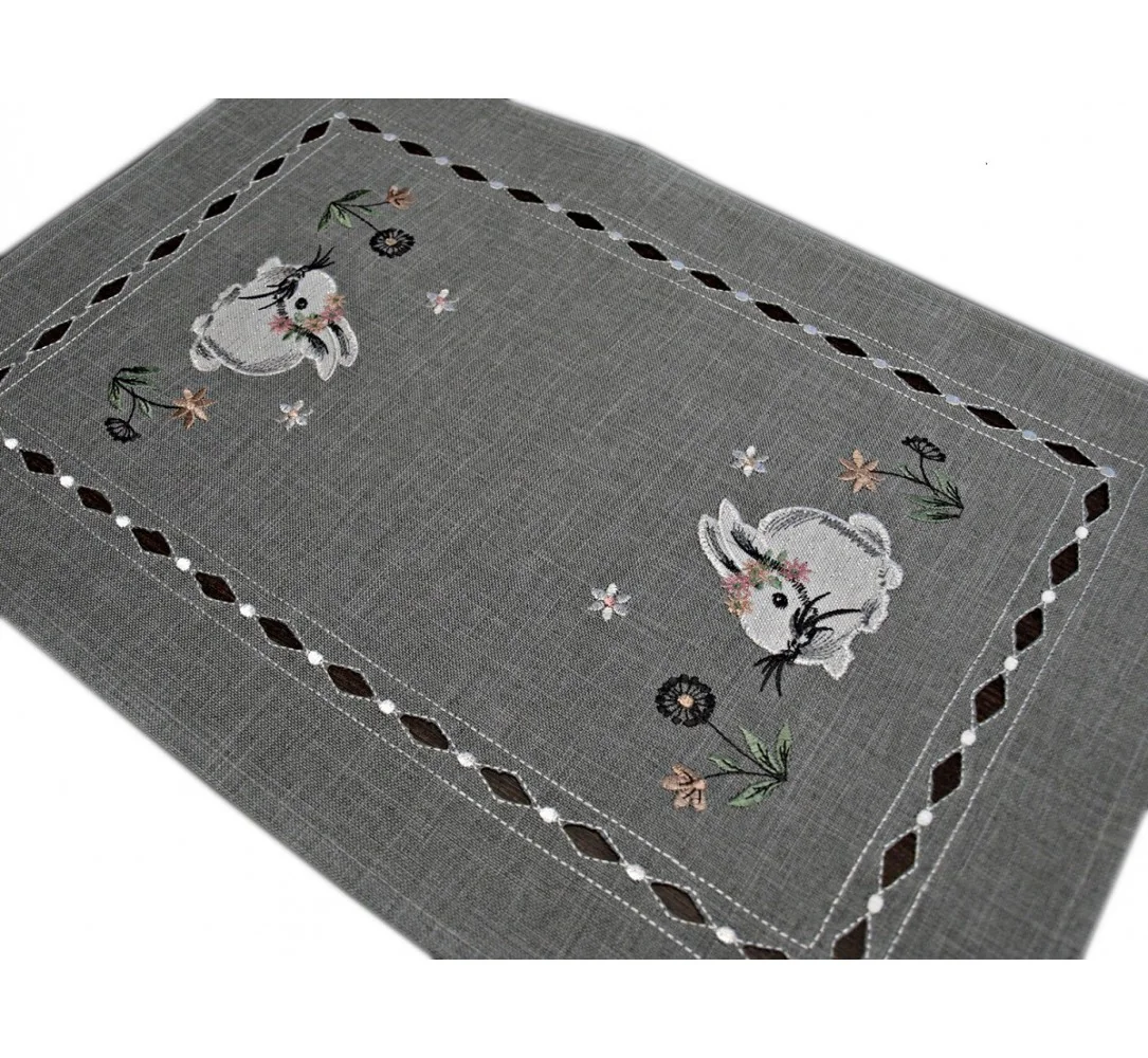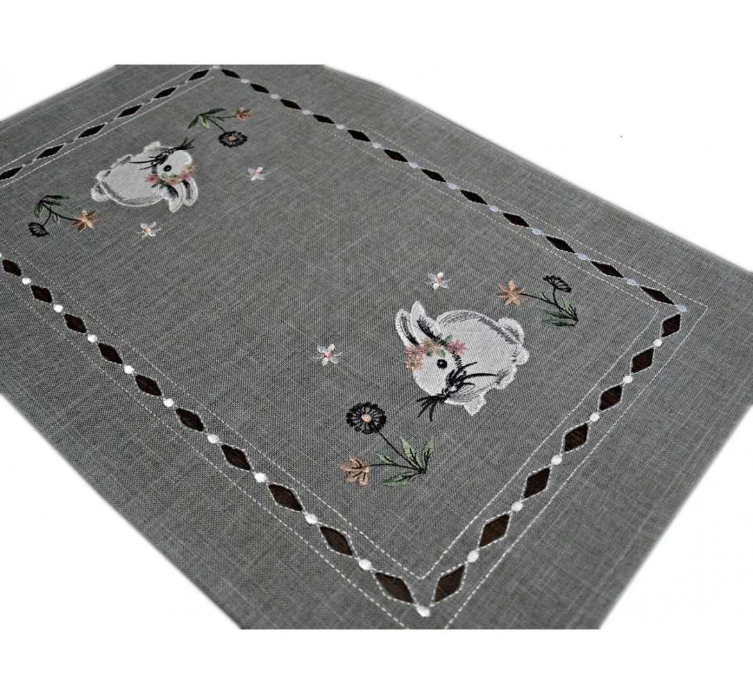 Nakładka świąteczna w rozmiarze 30 x 45 cm w kolorze szarym z aplikacja zajączka w białym kolorze, została wykonana z tkaniny 100 % poliestrowej, charakteryzuje się nowoczesnym desingiem, świątecznym nastrojowym wzorem oraz modnym kolorem dodatkową ozdobą jest haft wokół serwetki.