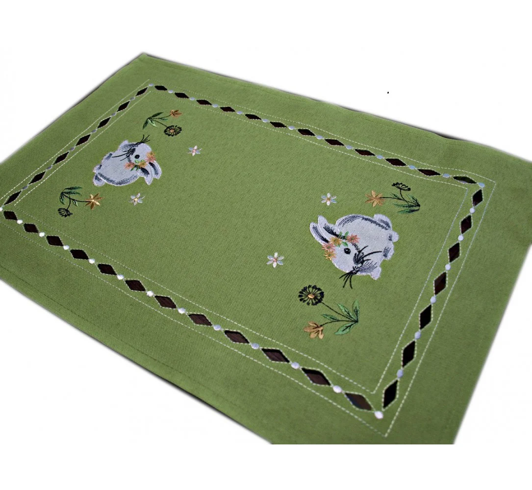 Nakładka świąteczna w rozmiarze 30 x 45 cm w kolorze zielonym z aplikacja zajączka w białym kolorze, została wykonana z tkaniny 100 % poliestrowej, charakteryzuje się nowoczesnym desingiem, świątecznym nastrojowym wzorem oraz modnym kolorem dodatkową ozdobą jest haft wokół serwetki.