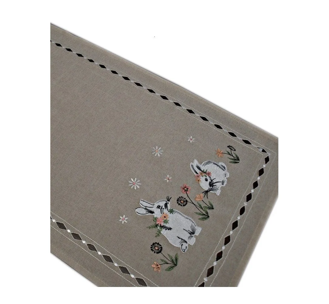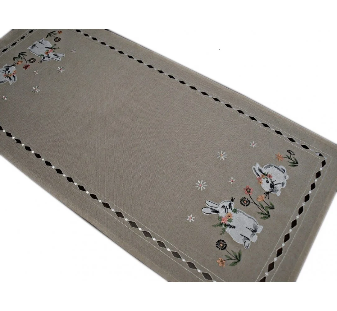 Nakładka świąteczna w rozmiarze 40 x 85 cm w kolorze beżowym z aplikacja zajączka w białym kolorze, została wykonana z tkaniny 100 % poliestrowej, charakteryzuje się nowoczesnym desingiem, świątecznym nastrojowym wzorem oraz modnym kolorem dodatkową ozdobą jest haft wokół serwetki.