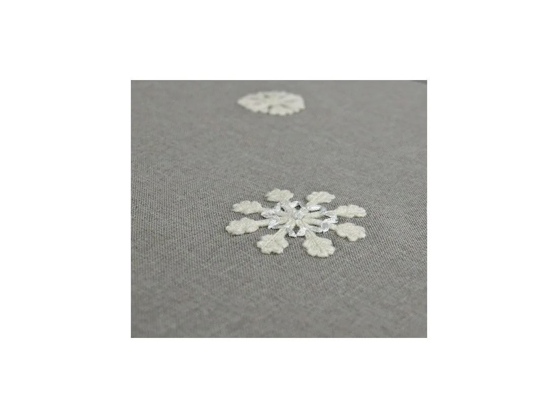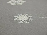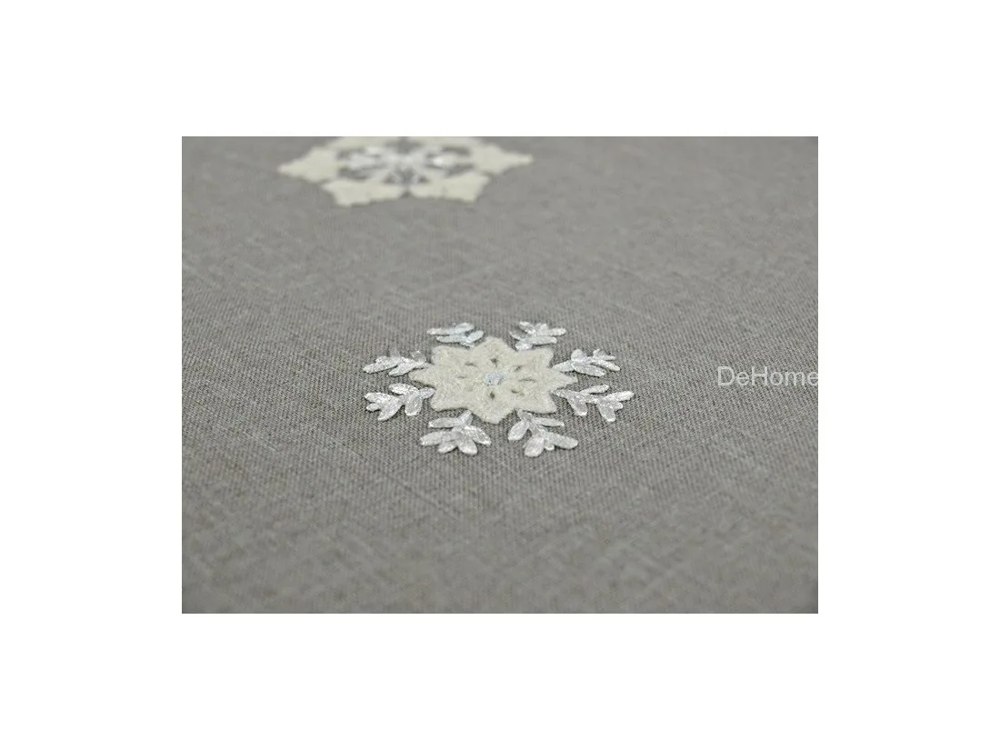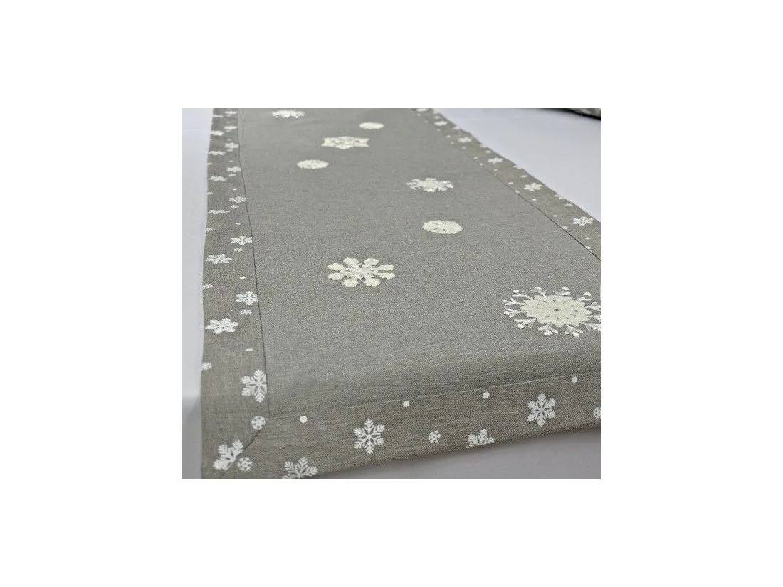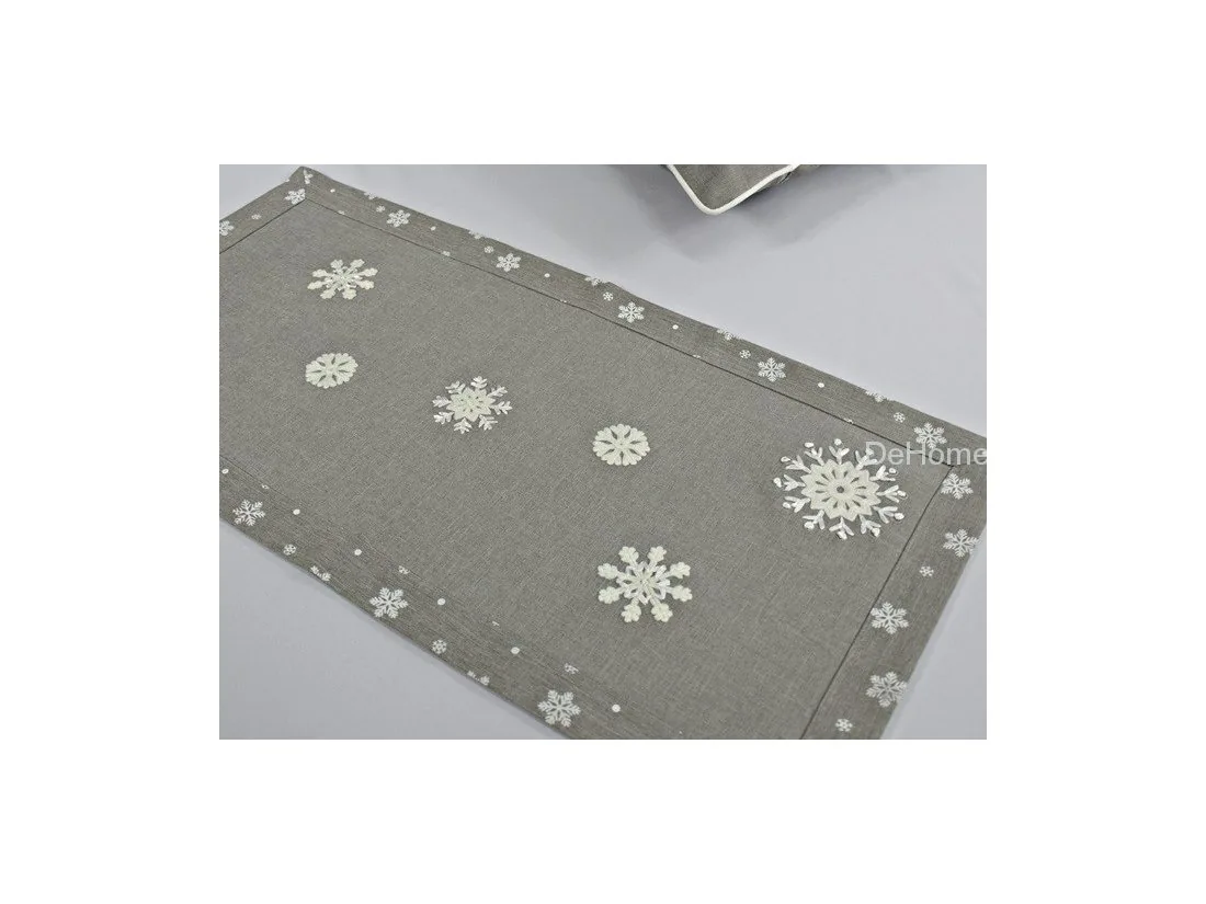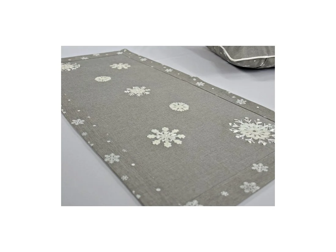 Nakładka świąteczna w rozmiarze 40x90 cm w kolorze szarym z aplikacją naszytych jasno kremowych śnieżynek.