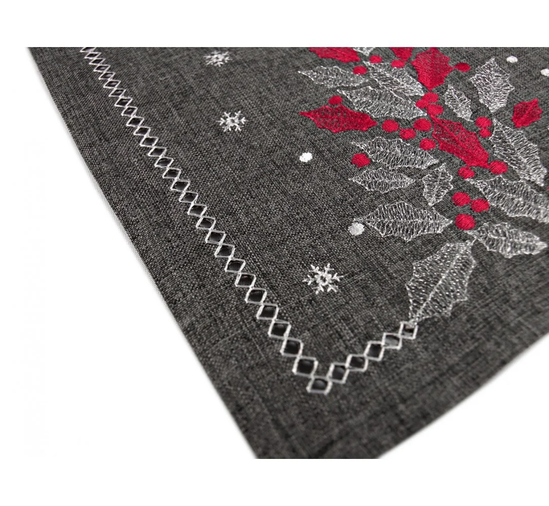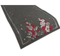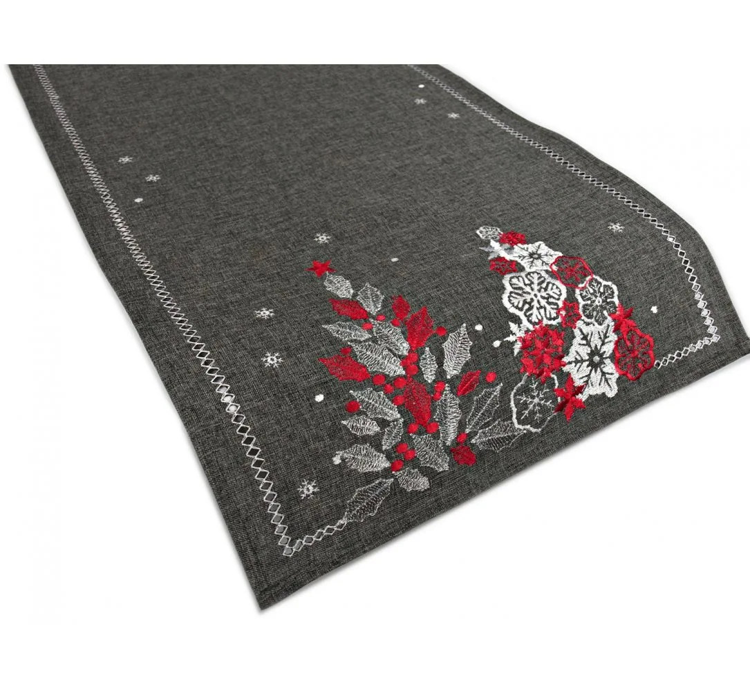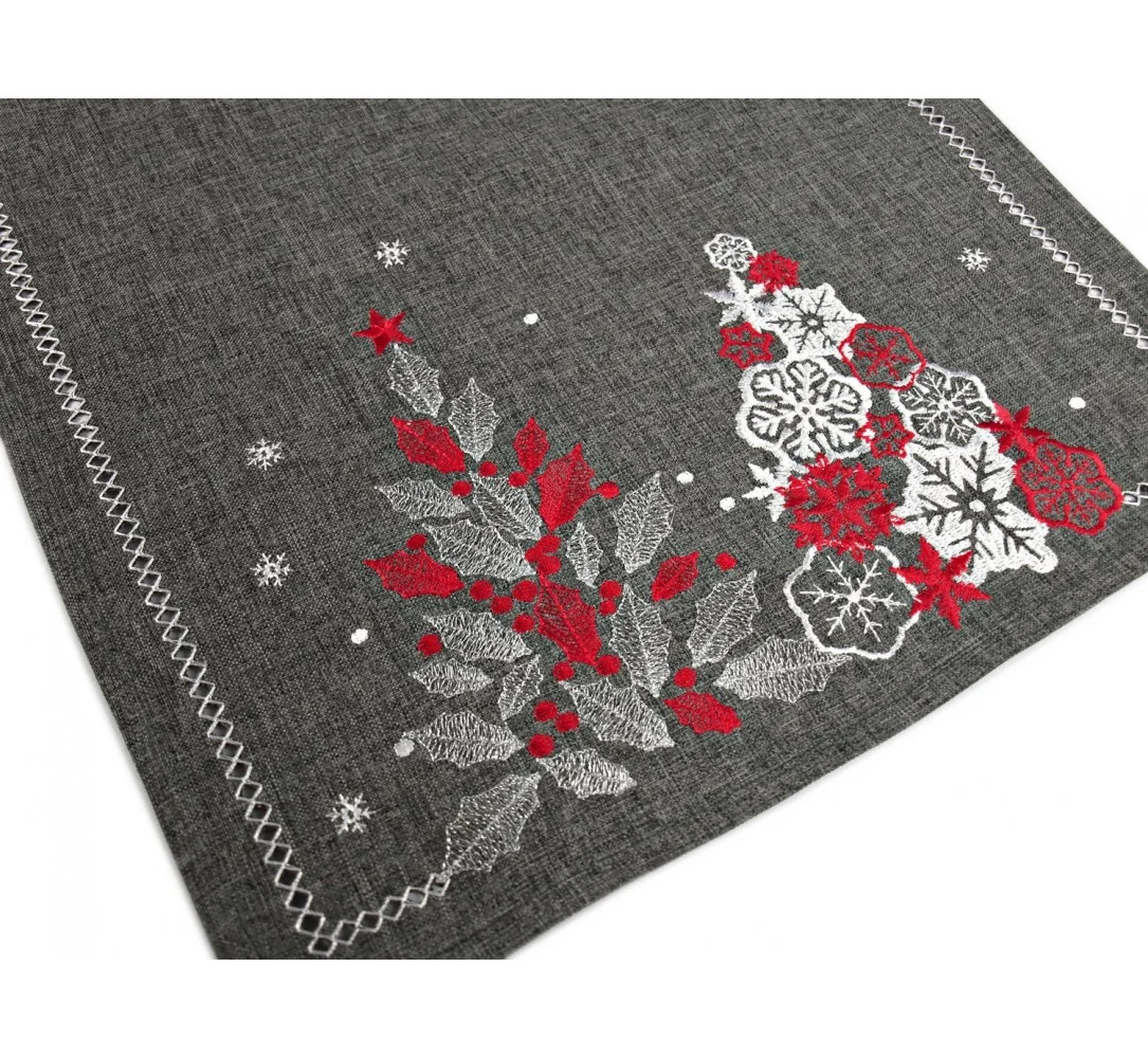 Bieżnik świąteczny w rozmiarze 35 x 70 cm w kolorze grafitowym z aplikacja haftowanych choinek w kolorze czerwono złotym.