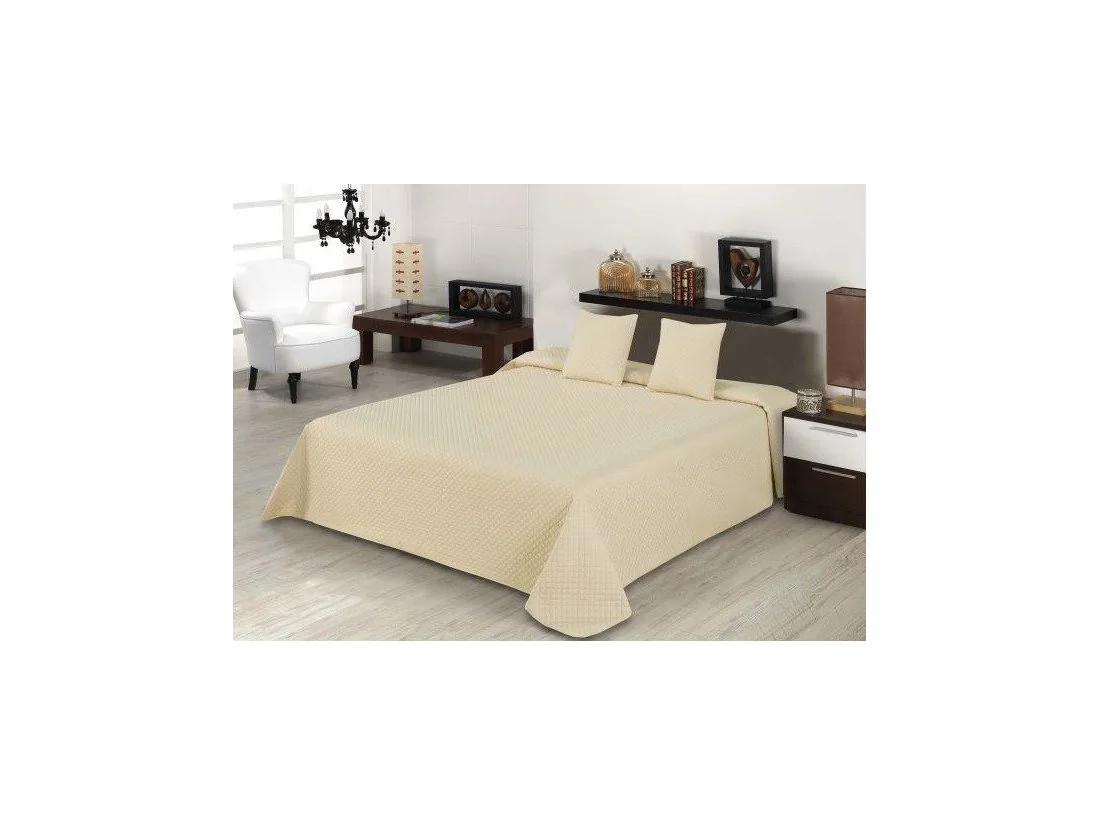 Klasyczna narzuta jednobarwna w rozmiarze 220x240 cm z dwoma poszewkami na poduszki 40x40 cm w kolorze jasno beżowym z nowoczesnym delikatnym tłoczeniem w kształcie rombów.