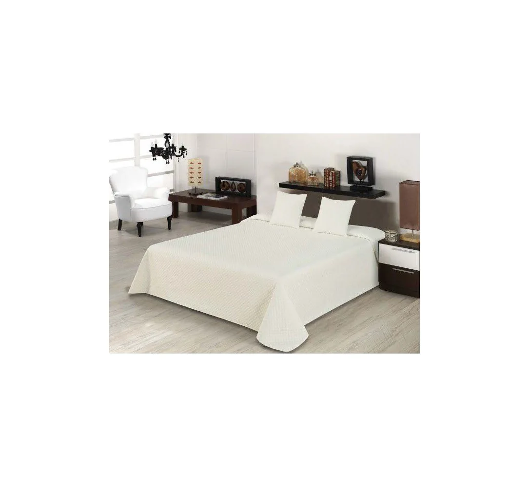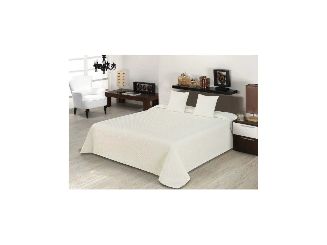 Klasyczna narzuta jednobarwna w rozmiarze 220x240 cm z dwoma poszewkami na poduszki 40x40 cm w kolorze Jasno kremowym z nowoczesnym delikatnym tłoczeniem w kształcie rombów.