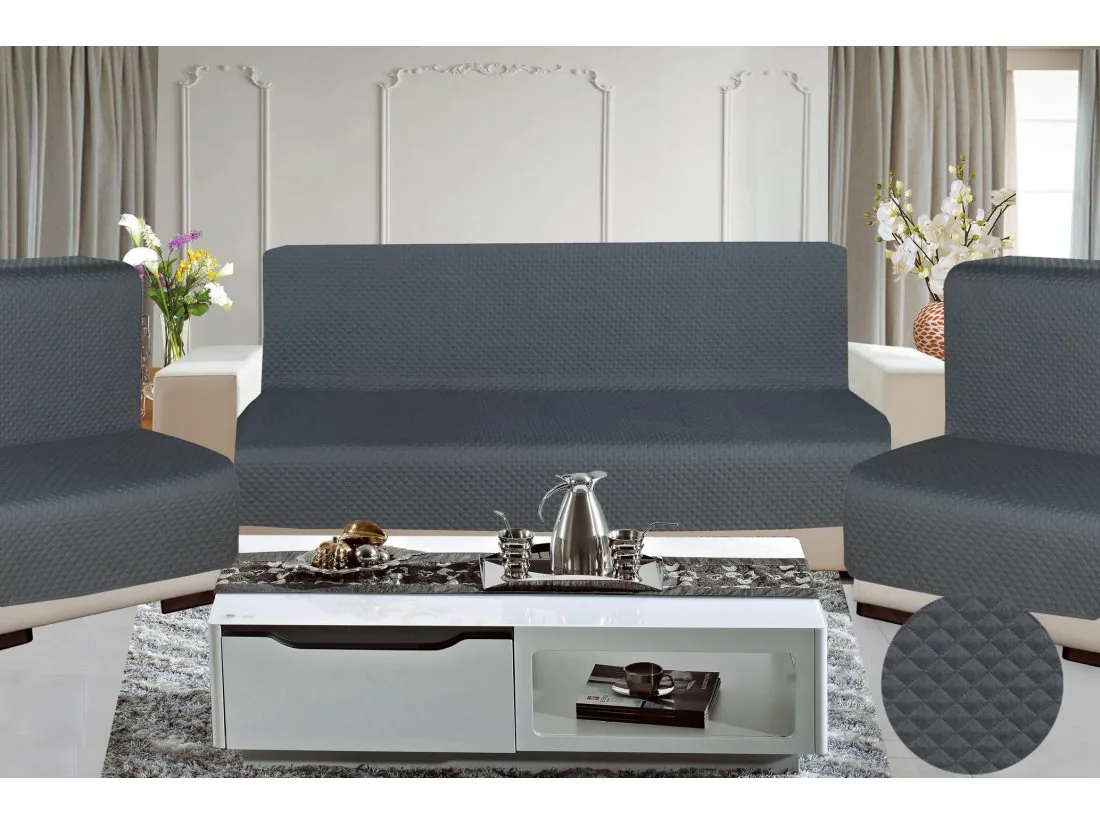 Klasyczny komplet narzuty dwustronnej w rozmiarze 160X210 cm oraz 2 szt narzut 70x160 cm na fotel w kolorze szaro grafitowym z nowoczesnym delikatnym tłoczeniem.