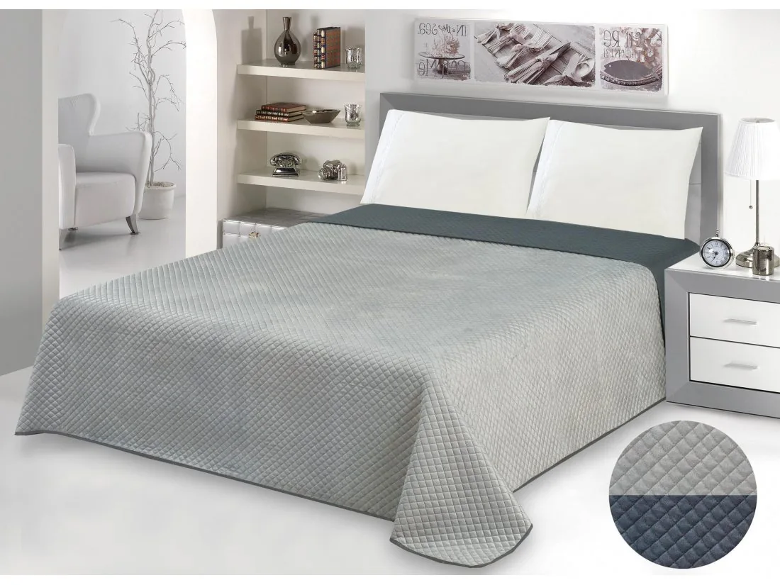 Klasyczny komplet narzuty dwustronnej w rozmiarze 160X210 cm oraz 2 szt narzut 70x160 cm na fotel w kolorze szarym oraz grafitowym z nowoczesnym delikatnym tłoczeniem.