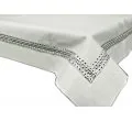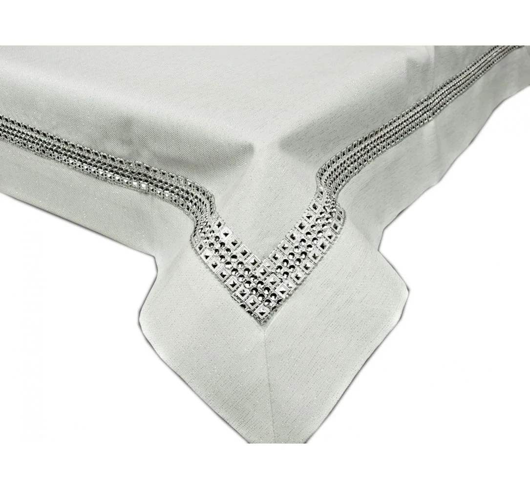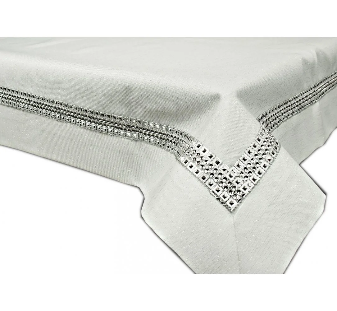 Dekoracyjny obrus w rozmiarze 120x120 cm w kolorze białym przeplatany srebrna nitka z naszyta srebrną listwą imitującą cyrkonie został wykonany ze 100 % poliestrowej tkaniny.