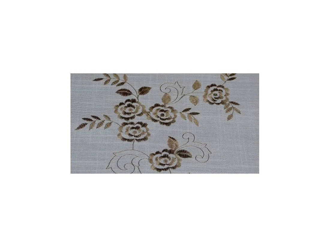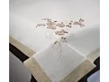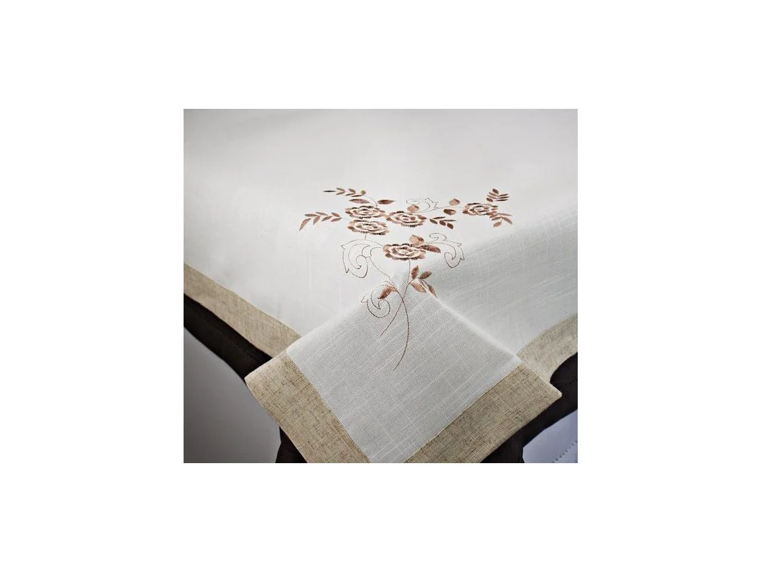 Obrus z haftem 110x160 cm został wykonany z wysokiej jakości tkaniny poliestrowej, dzięki starannemu wykończeniu oraz delikatnym kwiatowym haftem w kolorze beżowym obrus będzie ozdobą każdego wnętrza.