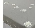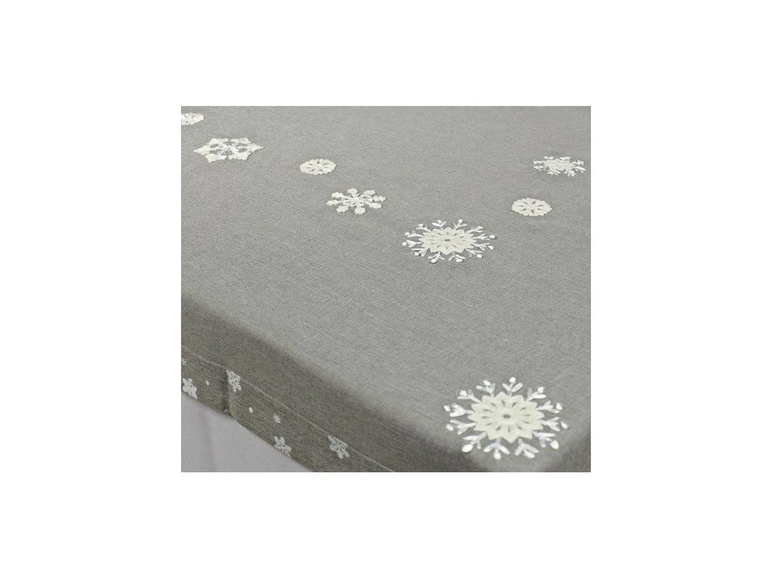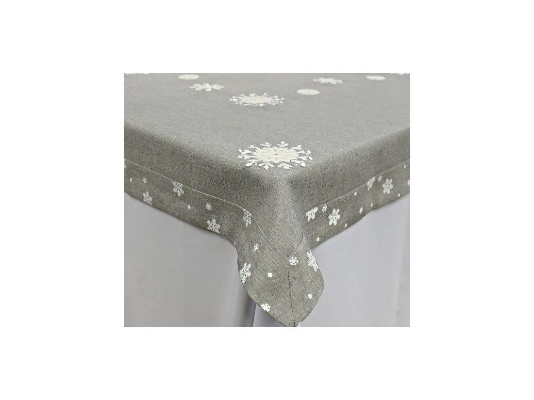 Obrus świąteczny w rozmiarze 110x160 cm w kolorze szarym z aplikacja naszytych jasno kremowych śnieżynek.