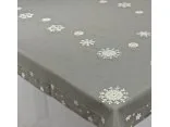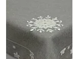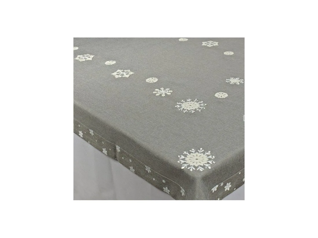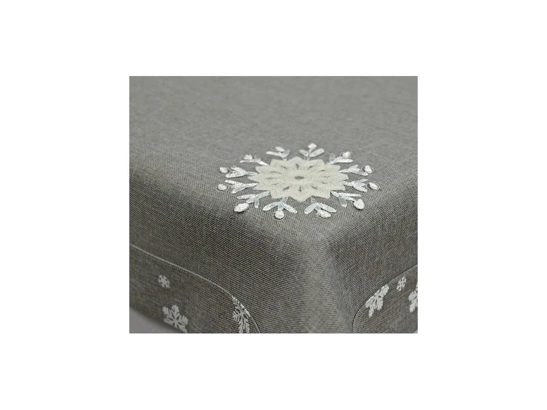 Obrus świąteczny w rozmiarze 110x160 cm w kolorze szarym z aplikacją naszytych jasno kremowych śnieżynek.