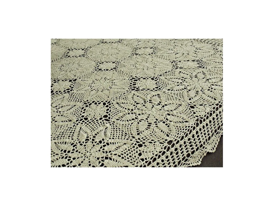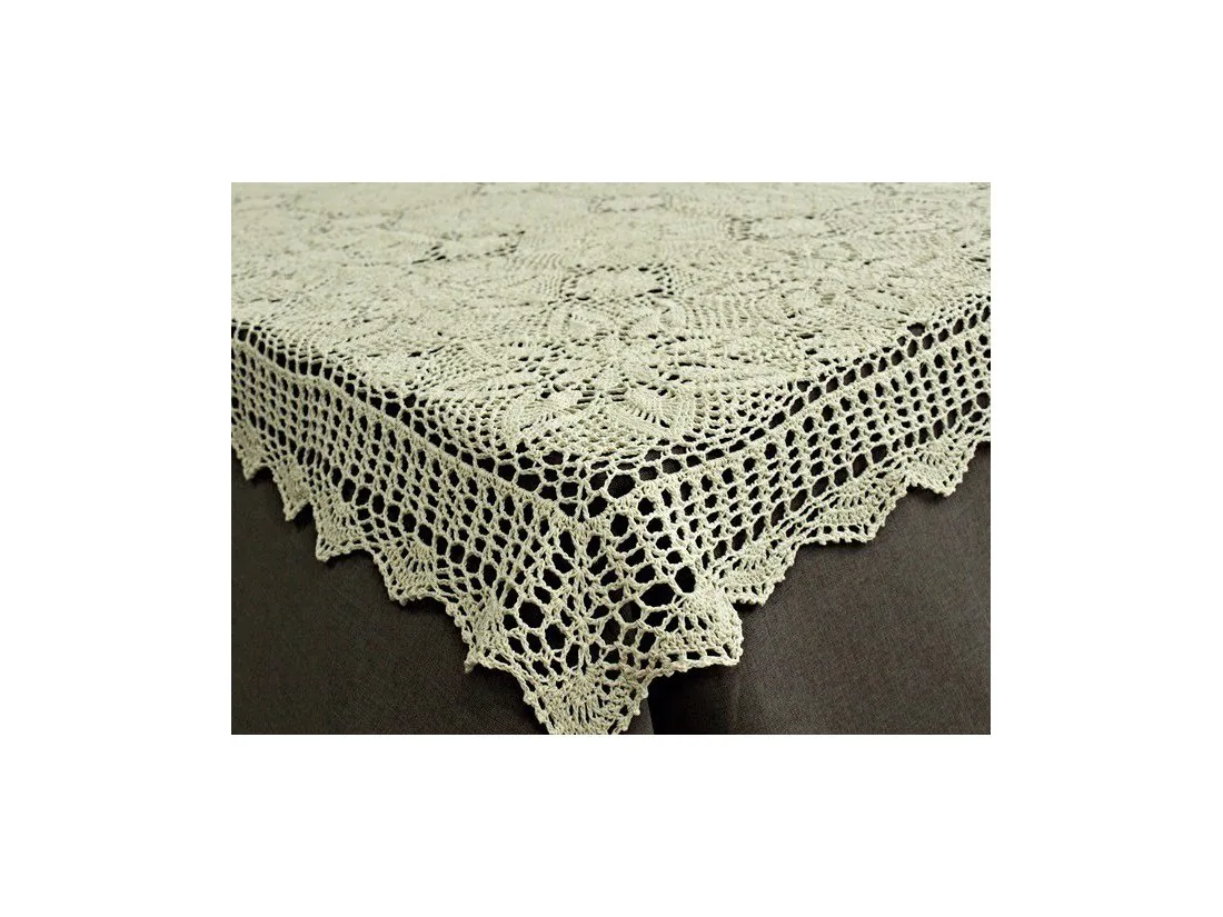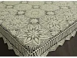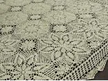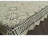 Obrus szydełkowy w rozmiarze 120 x 160 cm został wykonany z nici 100 % bawełnianej w kolorze lnianym.