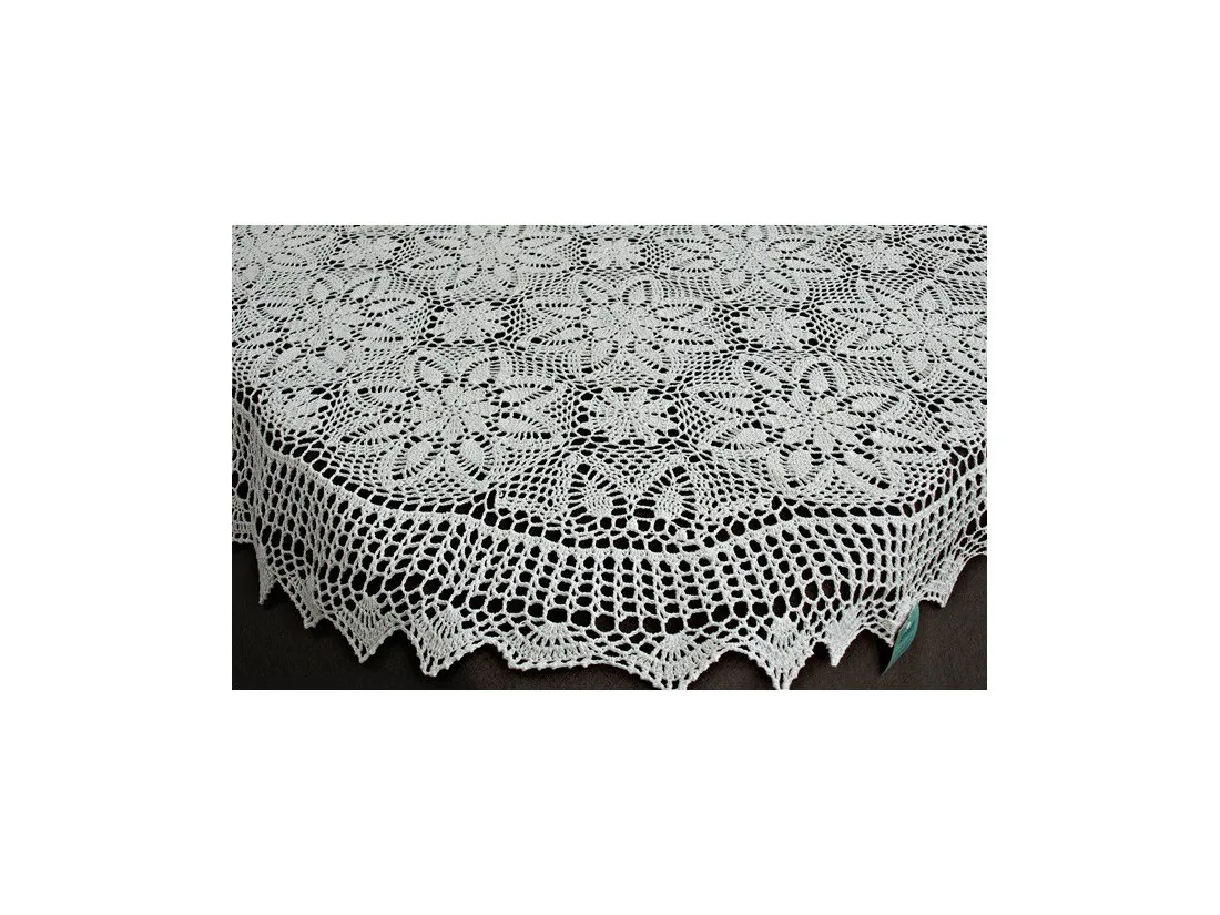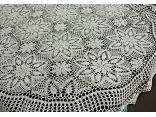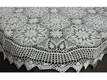 Obrus szydełkowy w rozmiarze 130 x 180 cm w kształcie owalnym został wykonany z nici 100 % bawełnianych w kolorze białym.