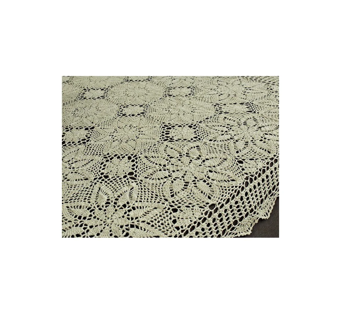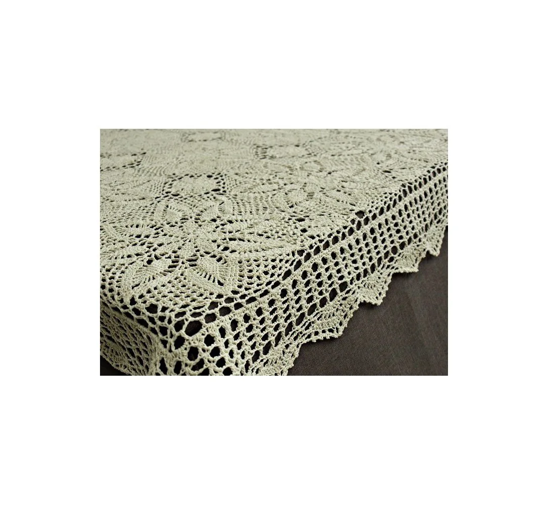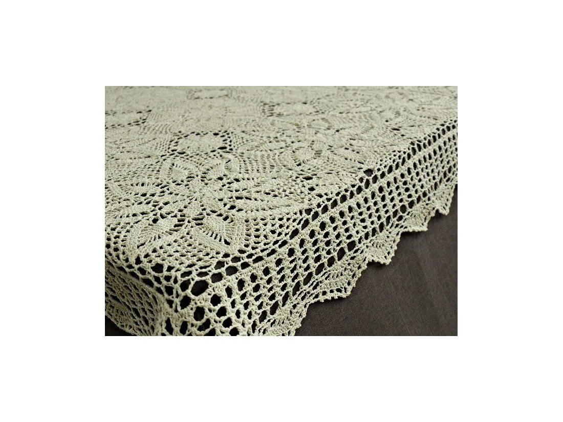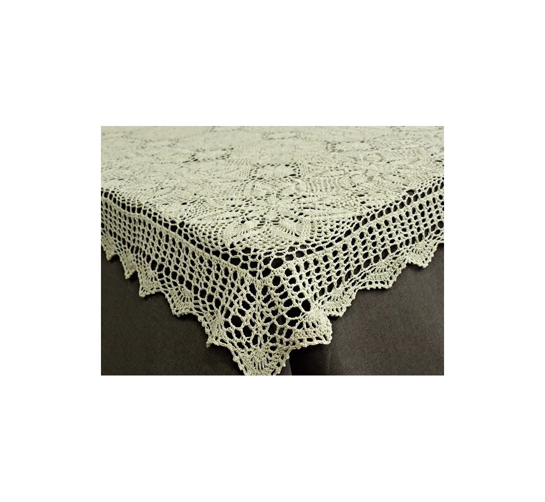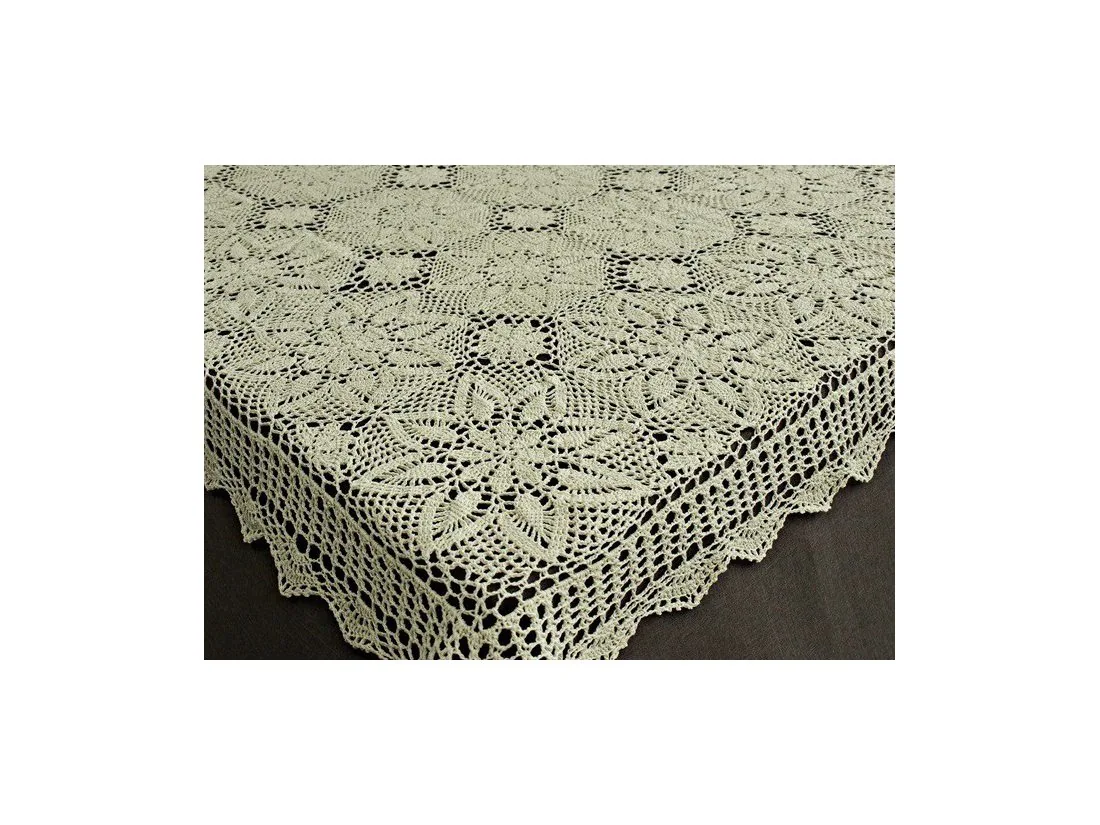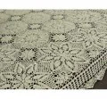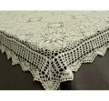 Obrus szydełkowy w rozmiarze 140 x 220 cm został wykonany z nici 100 % bawełnianej w kolorze lnianym.