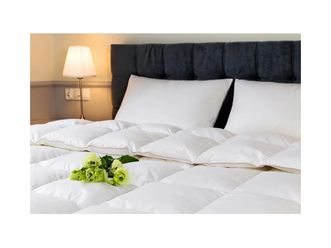 - Wypełnienie z 100% puchu gęsiego, pranego w komorach zewnętrznych.