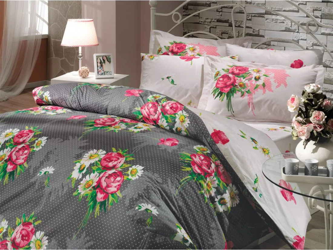 Klasyczna pościel z bawełny 4 elementowa w ciekawej kolorystyce szaro srebrno różowej oraz delikatnym kwiatowym wzorze to pełny zestaw, który składa się z poszwy 200x220 cm, 2 poszewek 50x70 cm oraz prześcieradła 240x260 cm.