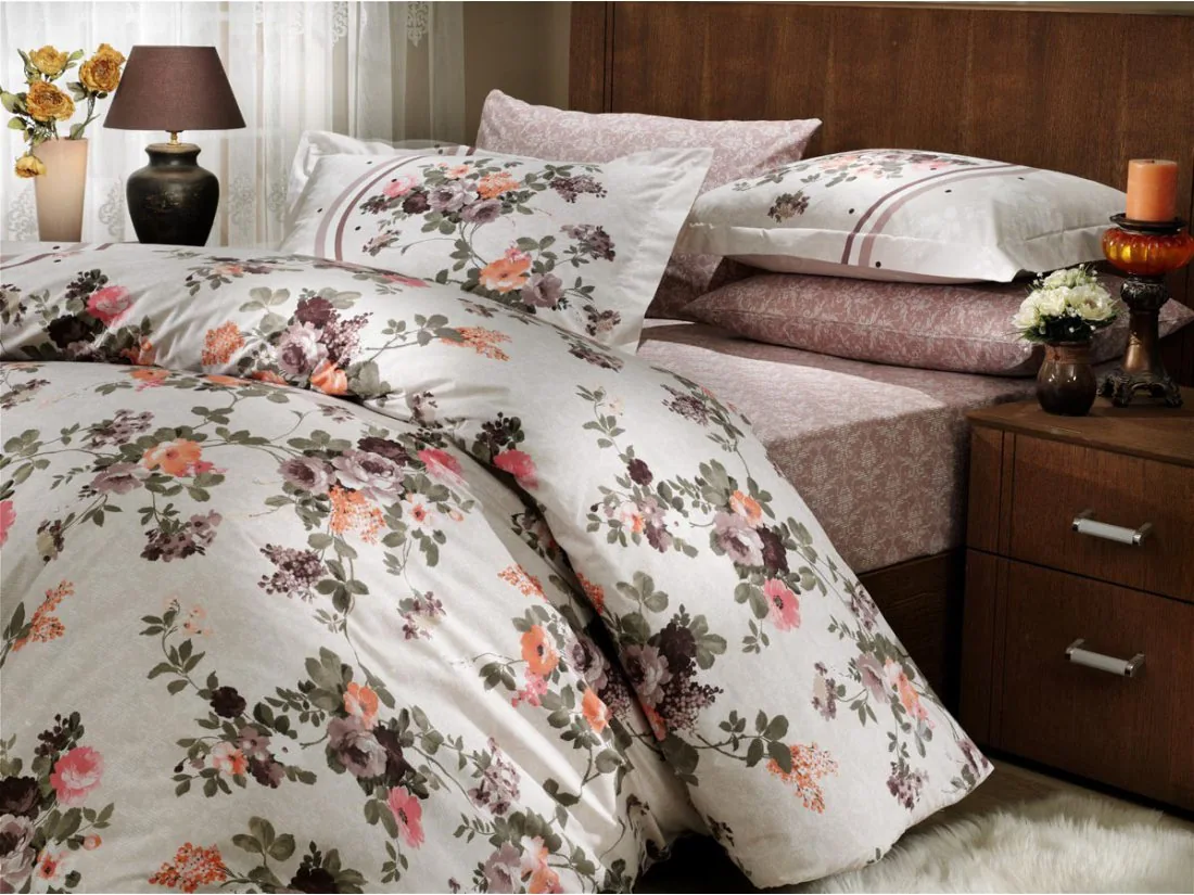 Klasyczna pościel z bawełny 4 elementowa w ciekawej kolorystyce beżowo kremowej oraz delikatnym kwiatowym wzorze to pełny zestaw, który składa się z poszwy 200x220 cm, 2 poszewek 50x70 cm oraz prześcieradła 240x260 cm.