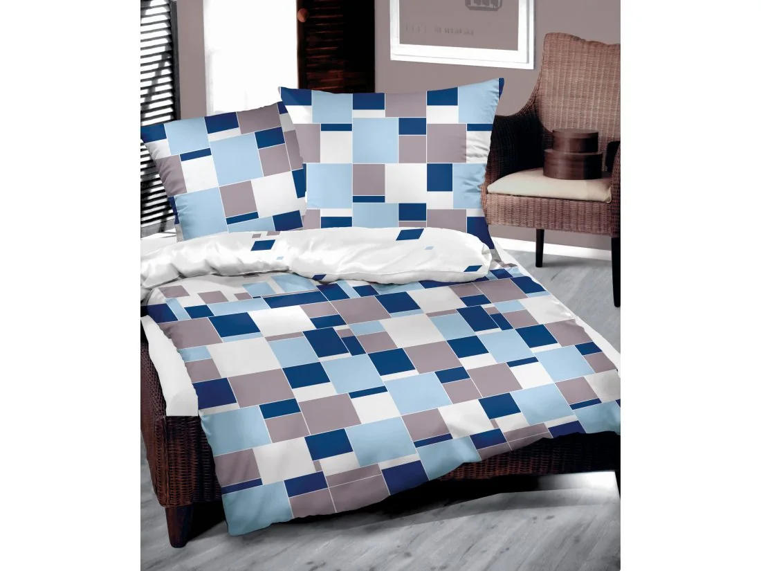 Fantazyjny geometryczny wzór pościeli znakomicie wkomponowany w niebiesko granatowo szarą kolorystykę intryguje oraz przyciąga wzrok.