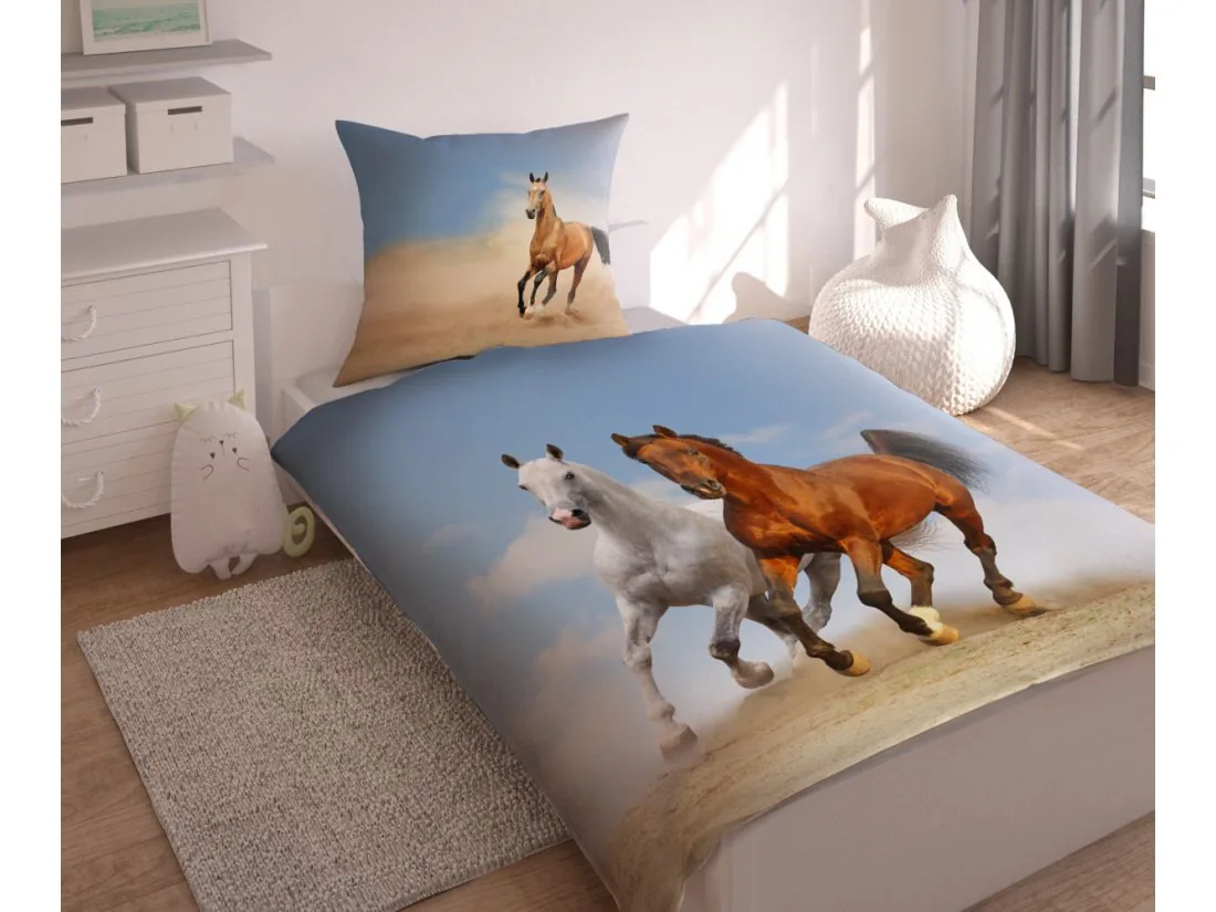 Pościel 100 % bawełniana z końmi cechuje wyjątkowa nasycona kolorystyka, której kolory zachowują swoją intensywność nawet po wielu praniach.