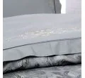 Delikatna szaro srebrna kolorystyka jak również ciekawe wzornictwo na pościeli tworzy piękną kompozycje, która przypadnie do gustu wszystkim romantykom którzy lubią unikatowe wzory. Luksusowa pościel model Emperium uosabiająca minimalizm a zarazem połączona z efektownym wykończeniem symbolizująca elegancje i luksus sprawi,że każda noc będzie niezapomniana.